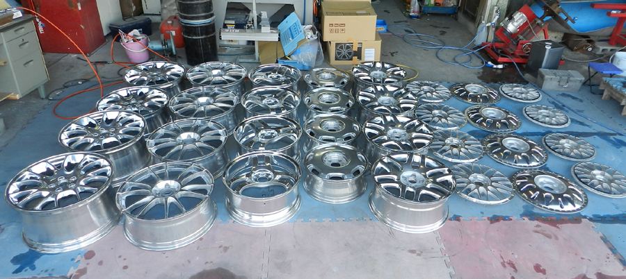 写真左から(フェラーリ純正20インチY様・OZ19インチN様・アドバン18インチN様・三菱純正16インチS様・ワーゲン純正19インチM様・LM20インチF様・OASIS20インチM様・LM17インチI様)仕上げは入荷順に進めておりノークリアーなら即日発送となりますが、溶剤オンクリアー、パウダーオンクリアー、カラークリアーなどはさらに次の工程が控えています。