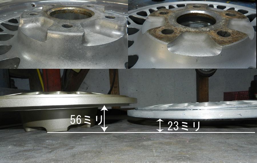 写真左が17インチによくある「ハイディスク」で写真右が今回のベースとなる希少な「ローディスク」です。比べて見て解るように33ミリつまり約1インチ以上もディスクの下駄の高さが違います。それをさらに凸凹の下駄を8ミリスライスしますので写真右の下駄の高さは15ミリになります。