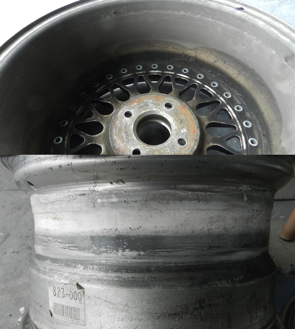 インリムは当店定番のパウダーグロスブラックを塗りますのでパウダー前の剥離からリム研磨!