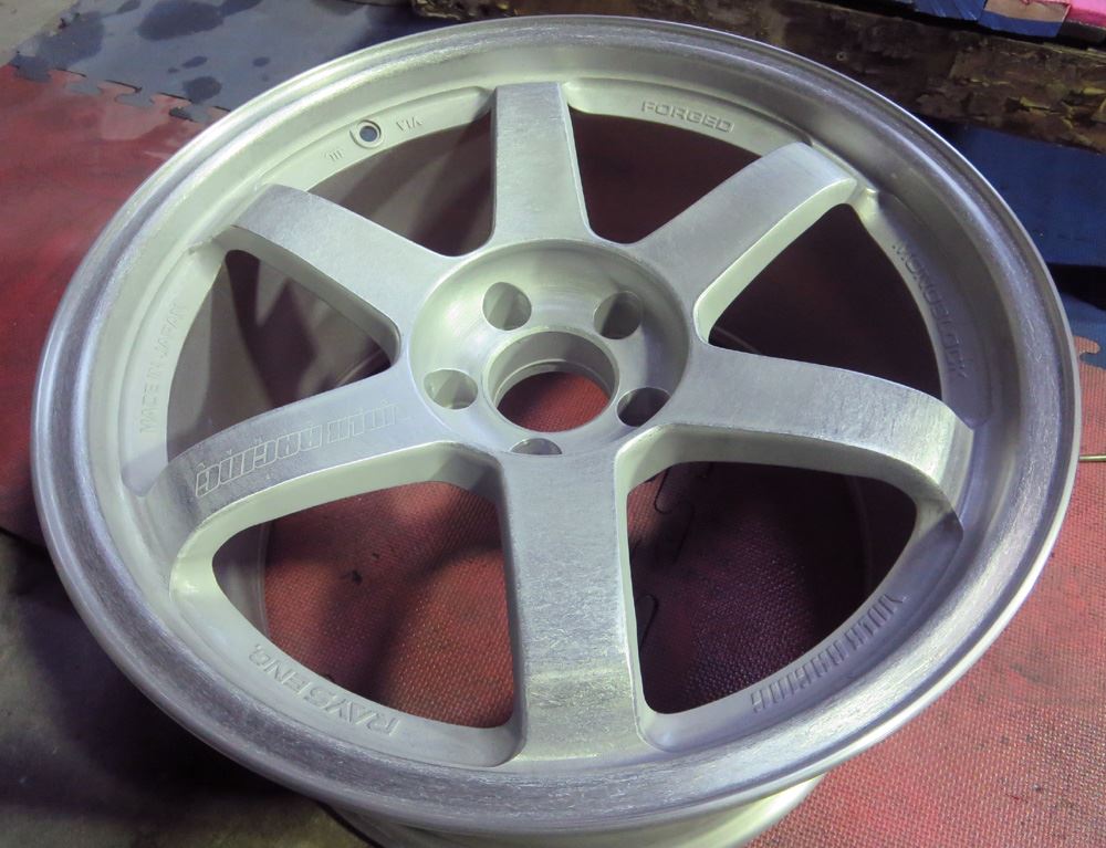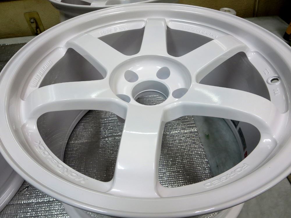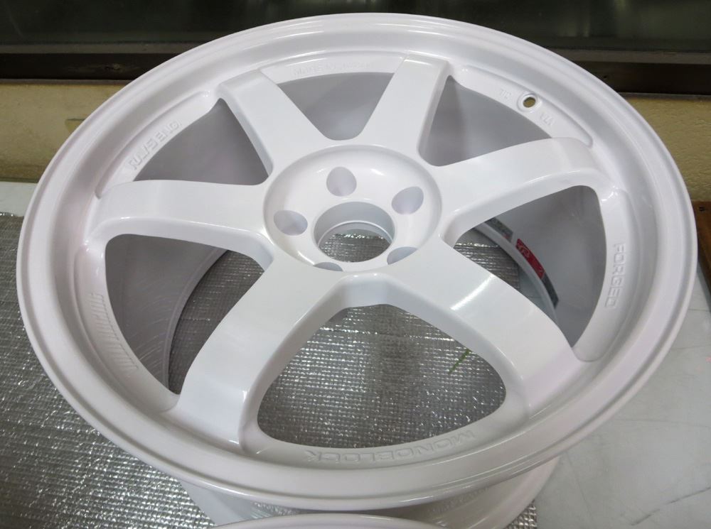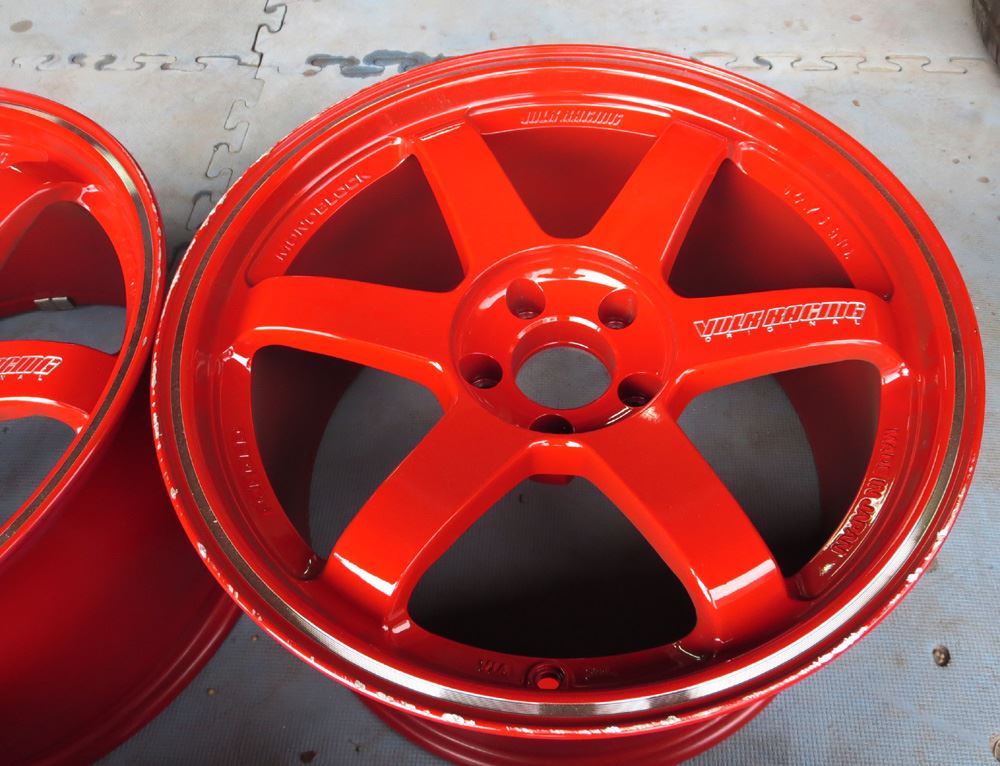 埼玉県のお客様・・・真っ赤なTE37RTです。TE37RTはリムへの切り込みラインと掘り込みロゴが入っていますがこれを削除して耐久性重視の真っ白なパウダーグロスホワイトフィニッシュ仕上げます。