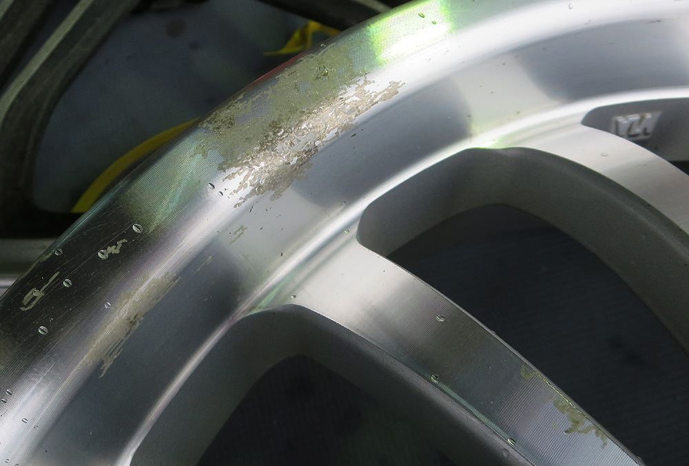 スポーク角部はクリアー層が薄いため水が浸入しますが、リムのシミは飛び石傷による水侵入です。