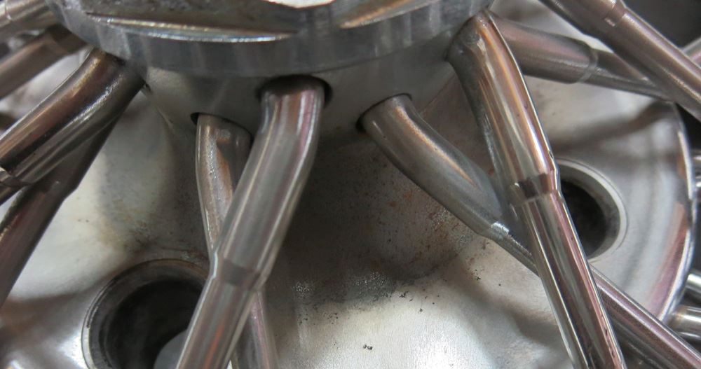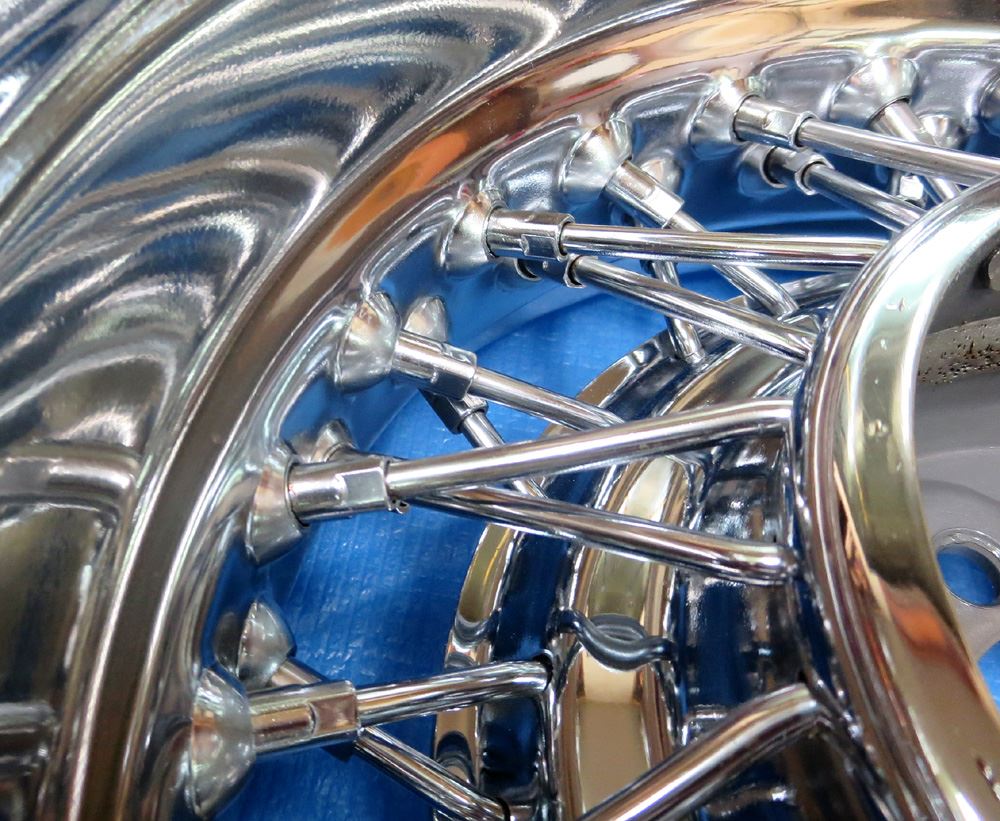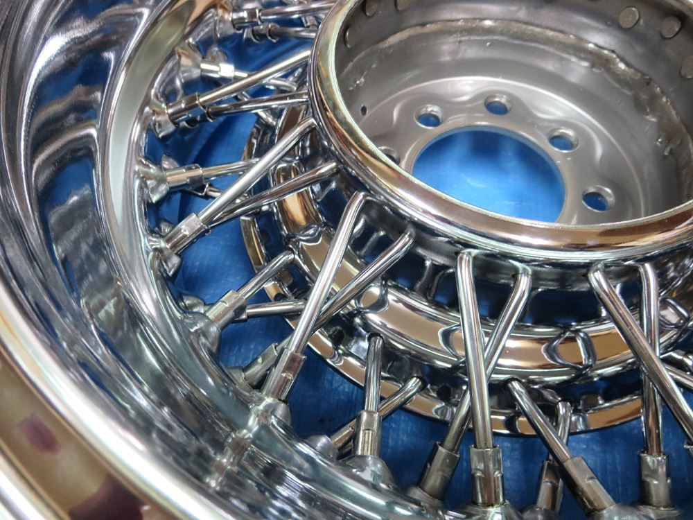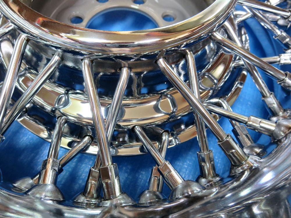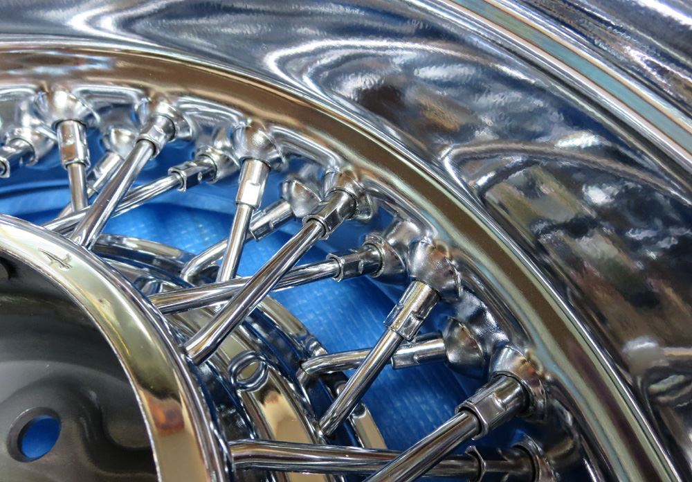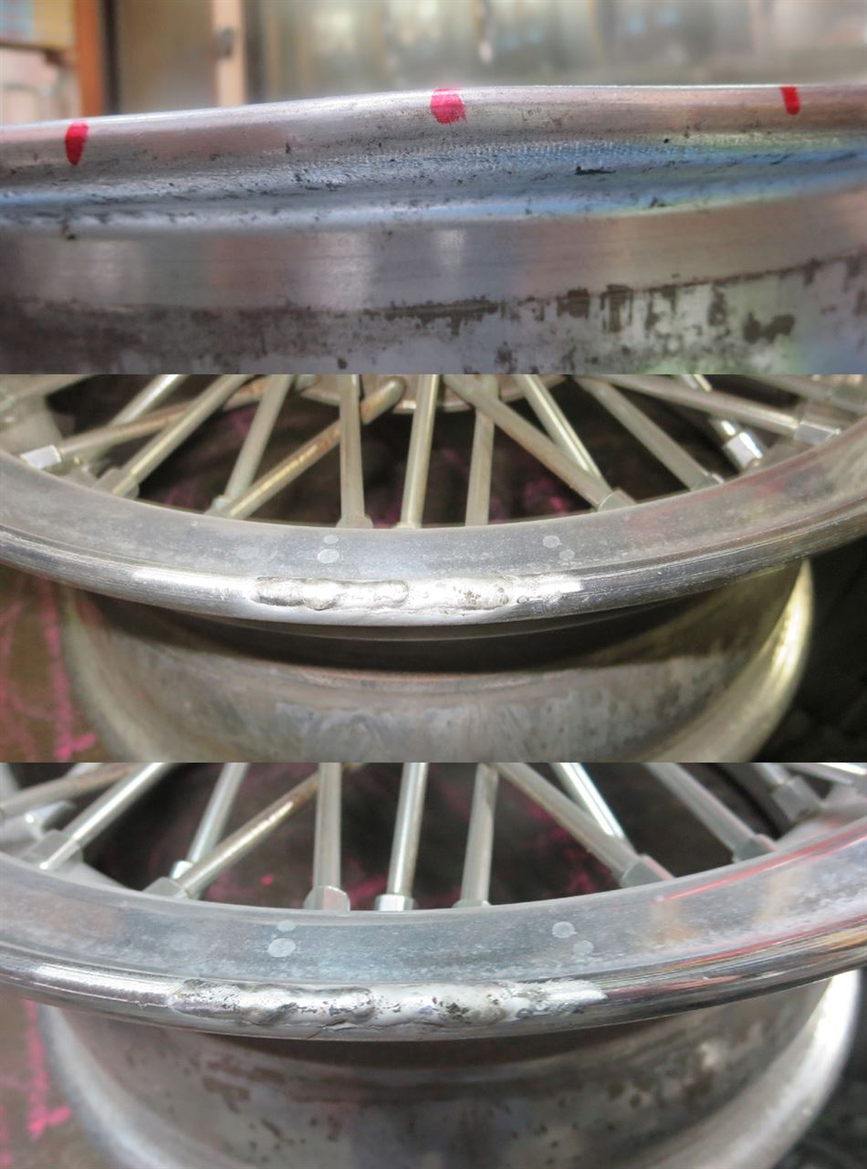 フルポリッシュは磨き込みによる素地表現のためカラー塗装の様にパテ埋めでの誤魔化しが出来ませんので肉盛り溶接せず傷が消えるまで削り込む研磨修理を良く見かけますがそんな事すればリム形状が変わって肉厚も薄くなり強度確保など無視した修理で論外です。