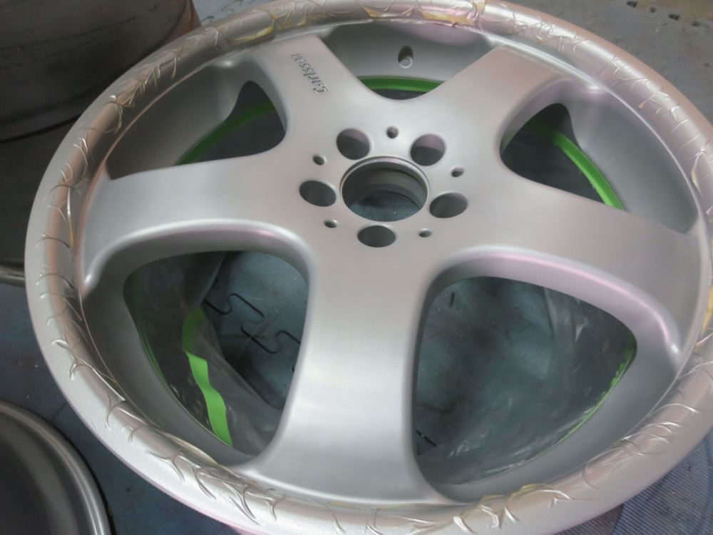 インナーリムから側面リムは溶剤カラーが被らない様にマスキングして先塗りベース塗のパウダーシルバー肌残しです。