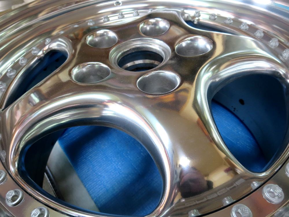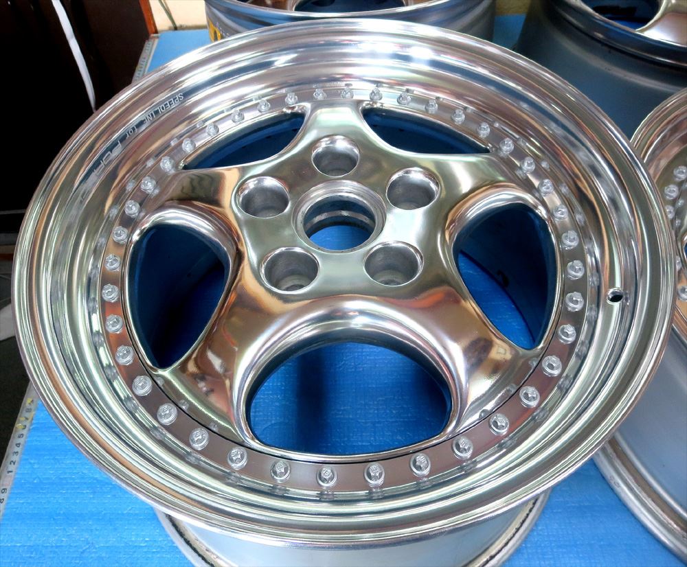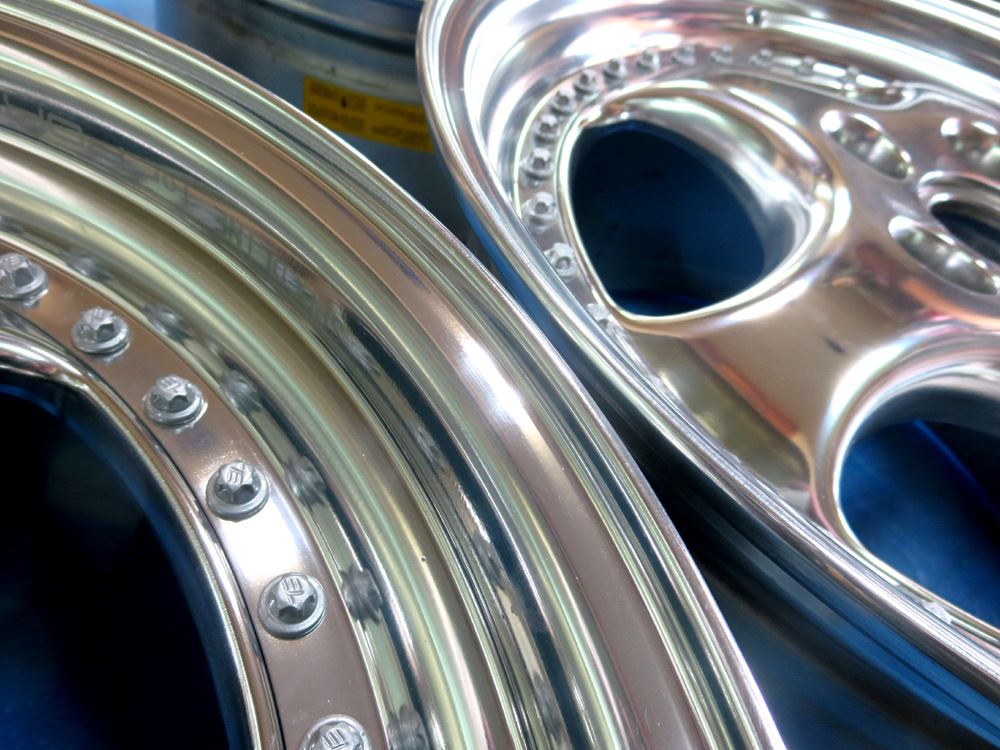 Super-RSは2Psリム本体~センターディスク~メッシュプレート~6角キャップ~ピアスボルトで構成されています。ピアスボルト以外全パーツ個別のバレル研摩フルポリッシュからフルパウダークリアーのフルコースカスタムです。