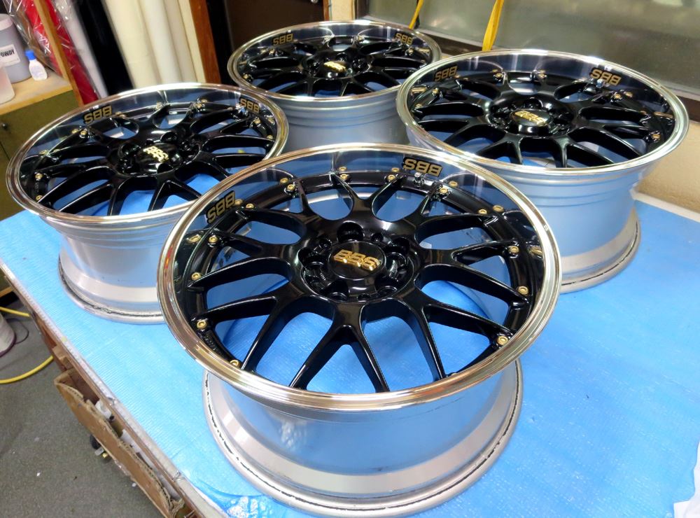 BBS-RS-GT18インチのリム傷修理のついでに「DSK-P(ハイパーシルバー+ダイヤモンドカット)」から「PGB-P(パウダーグロスブラック+BBFバフポリッシュ)」に気分一新で色替えですがどうせ塗るなら既製品には無いパウダーリメークでオリジナルロゴと耐久性重視が今回の拘りテーマです。