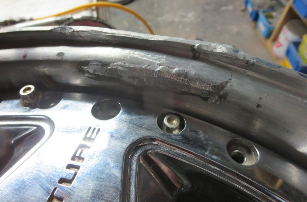 インリムの曲りとガリ傷肉盛り修理