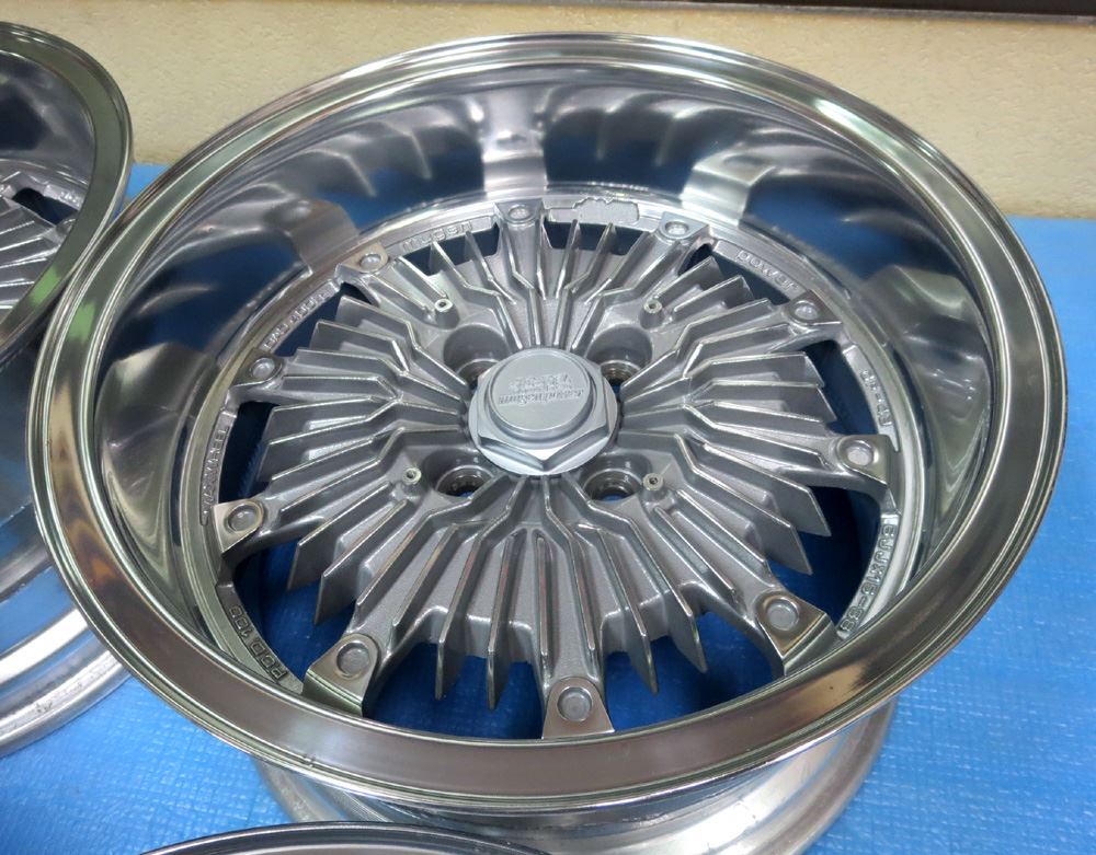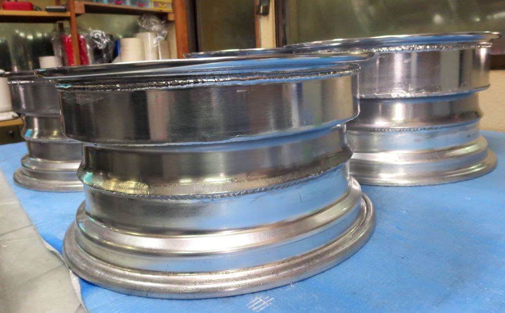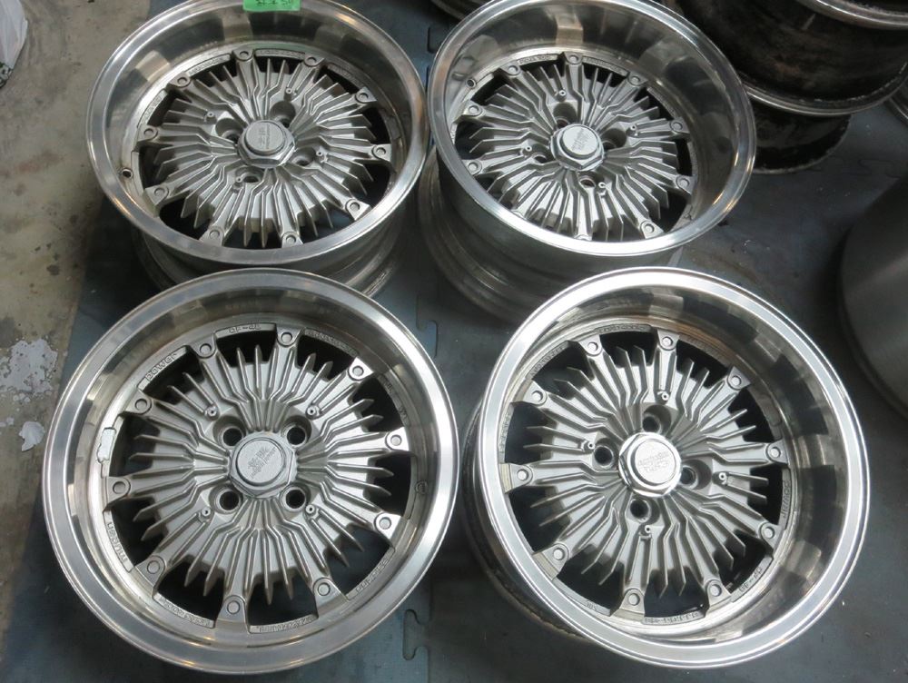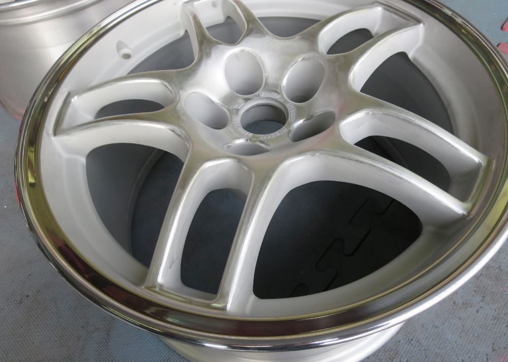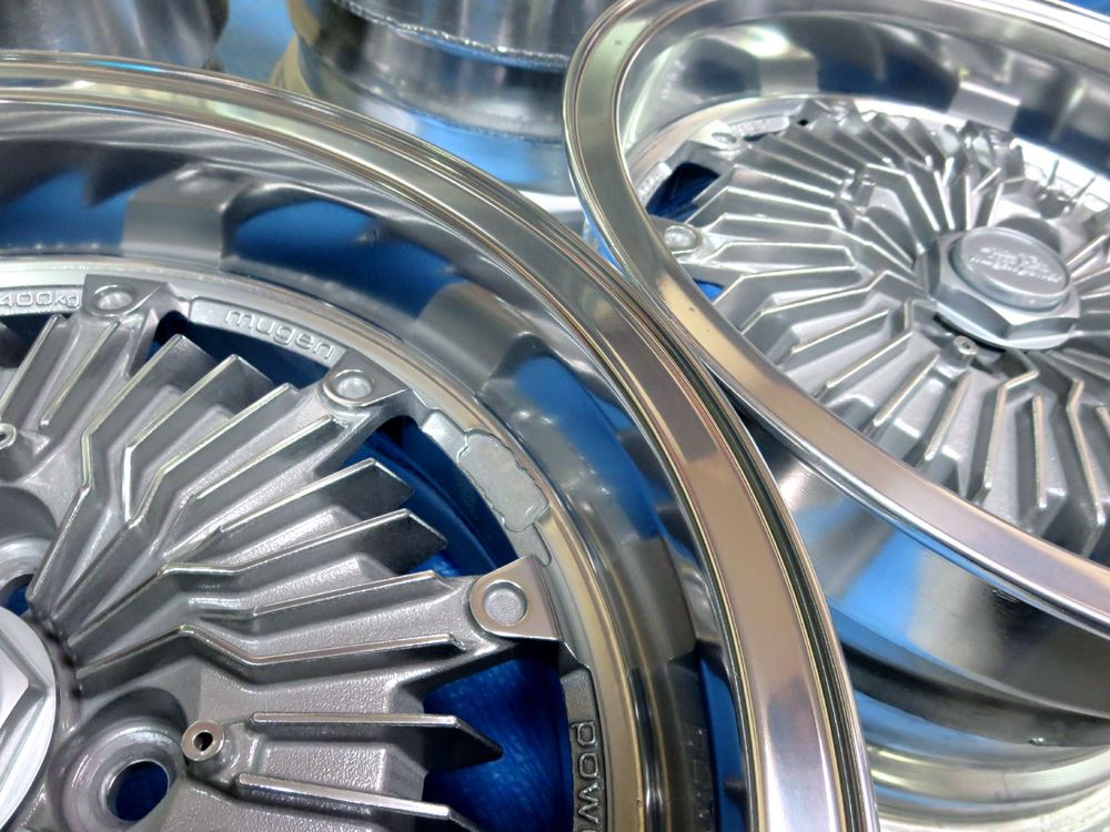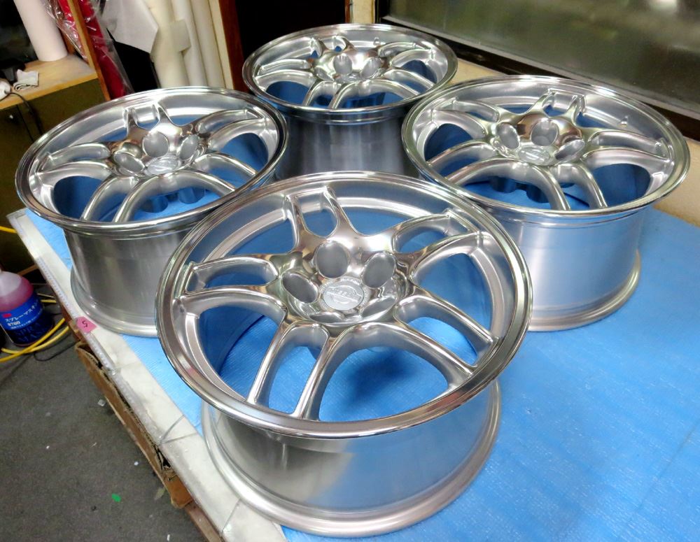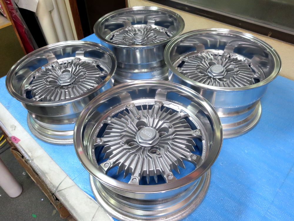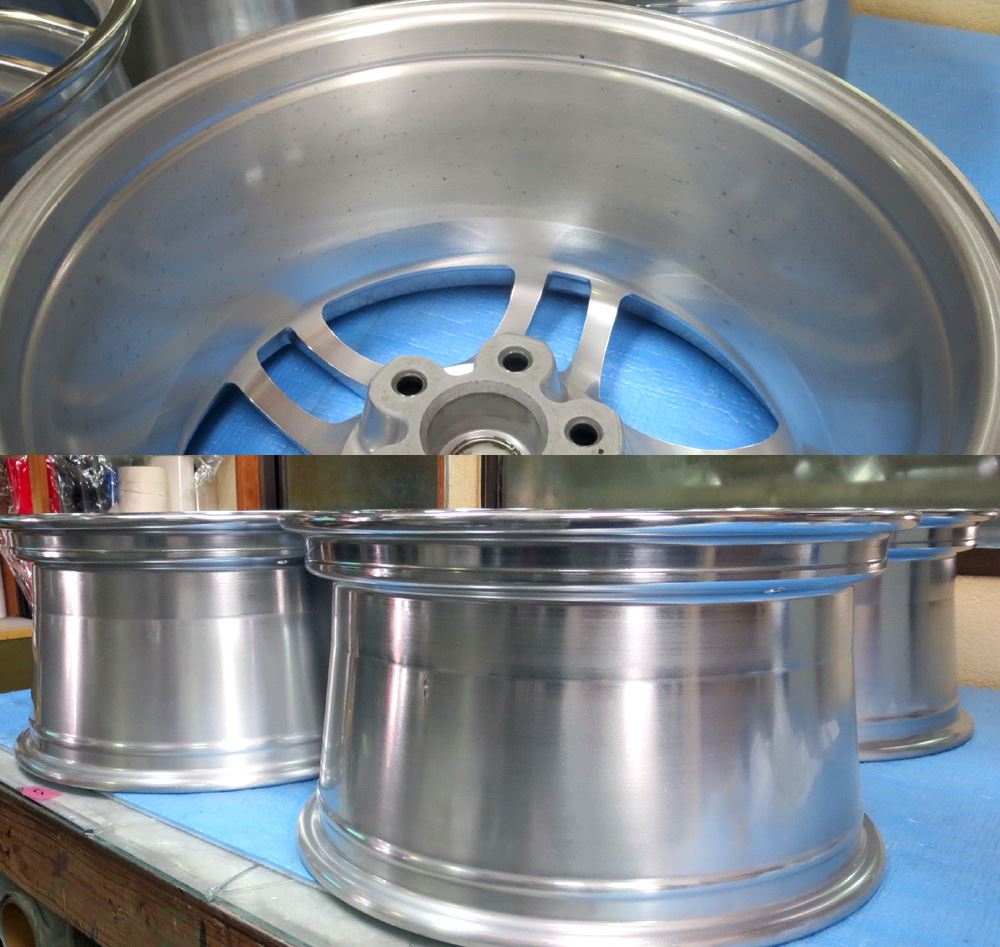 栃木県のお客様・・・無限改造深リム15インチ鋳造(CAST)とR33純正17インチ鍛造(FORGED)2台同時にバレル2次元研磨からのパウダークリアーご依頼いただきました。