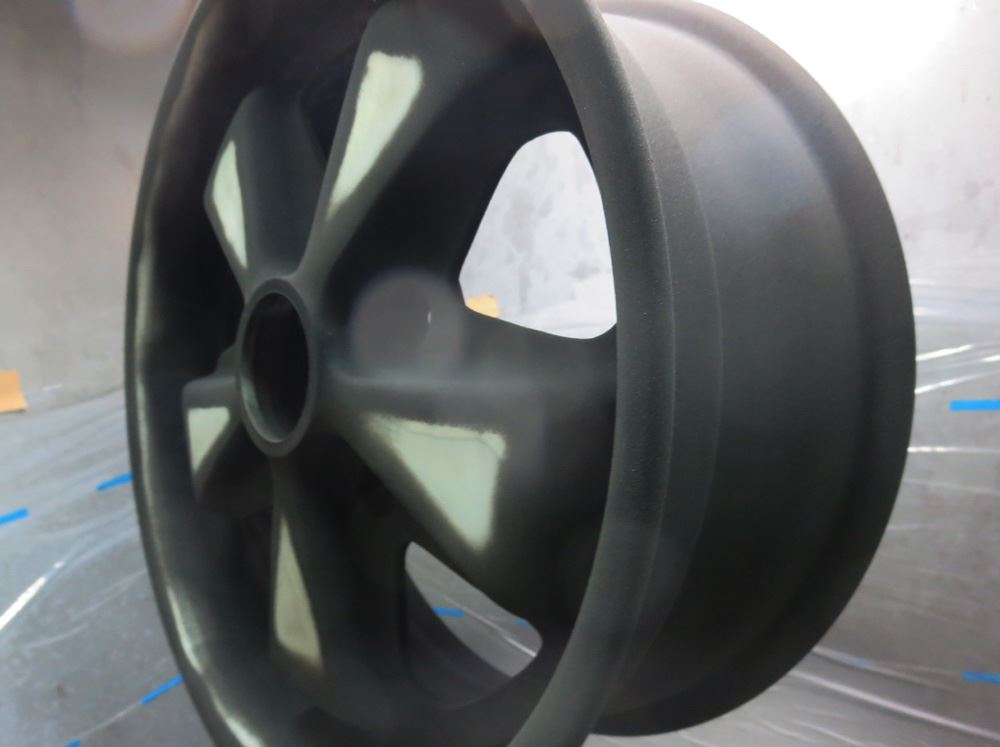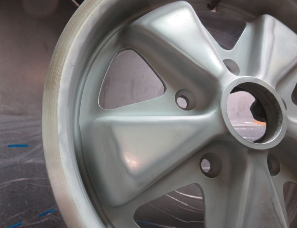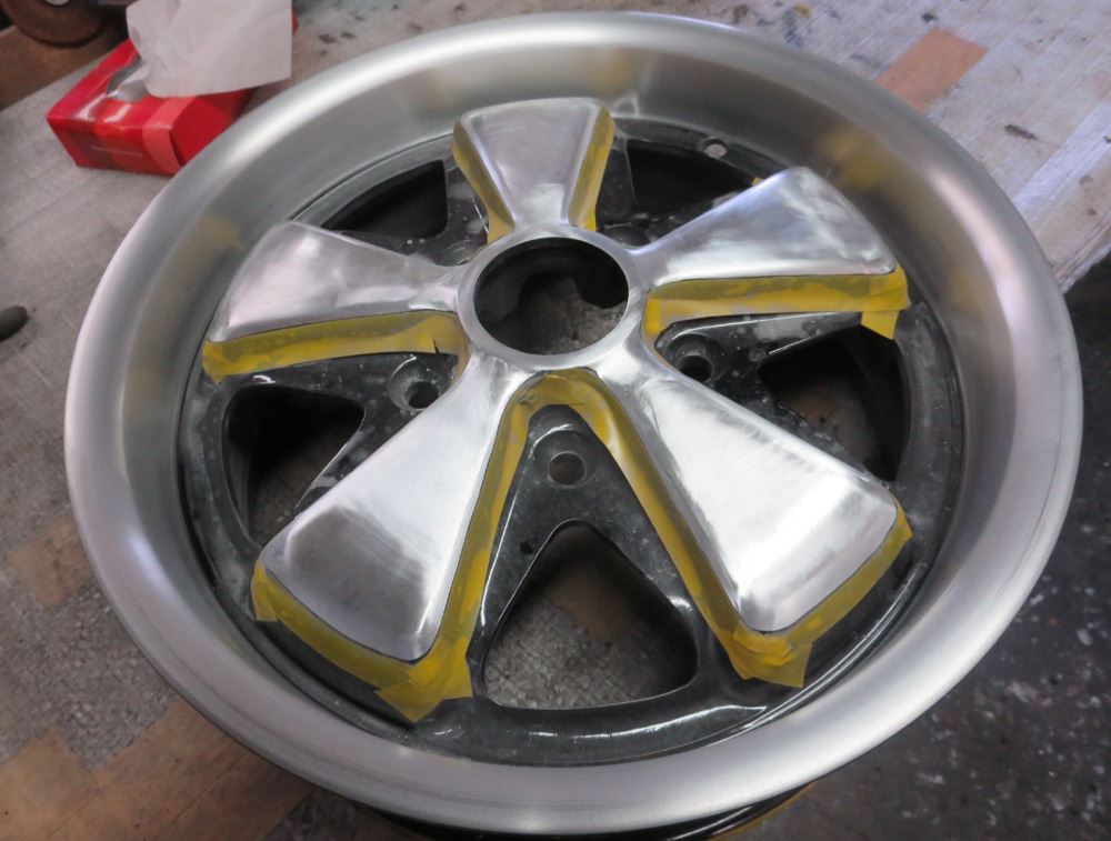 やや腐食痕が残っているためパウダークリアーは避けて溶剤硬質クリアーでコーティングしますのでインナーリムから側面リムはあえてパウダーコート肌を残すため一手間掛けてマスキング!