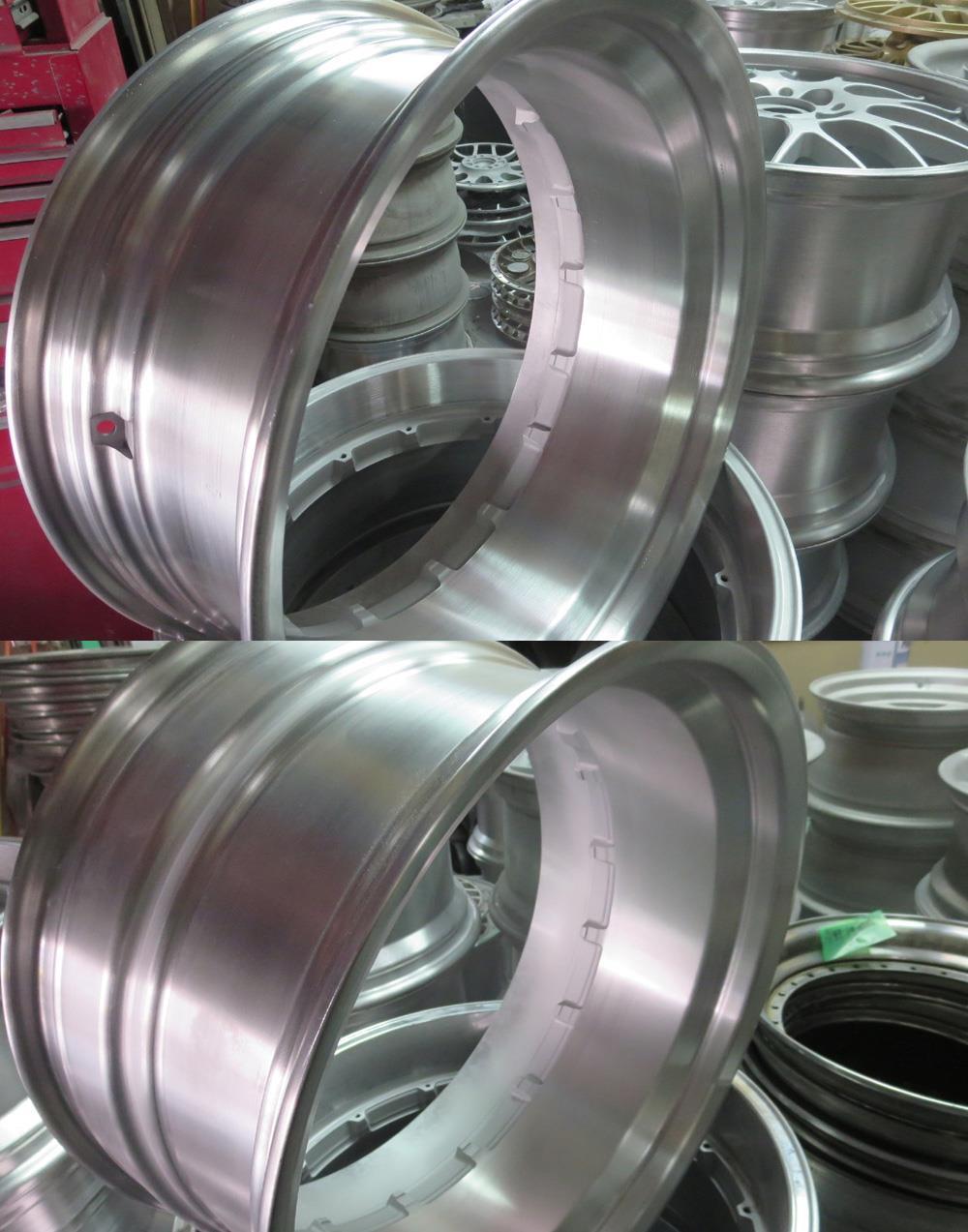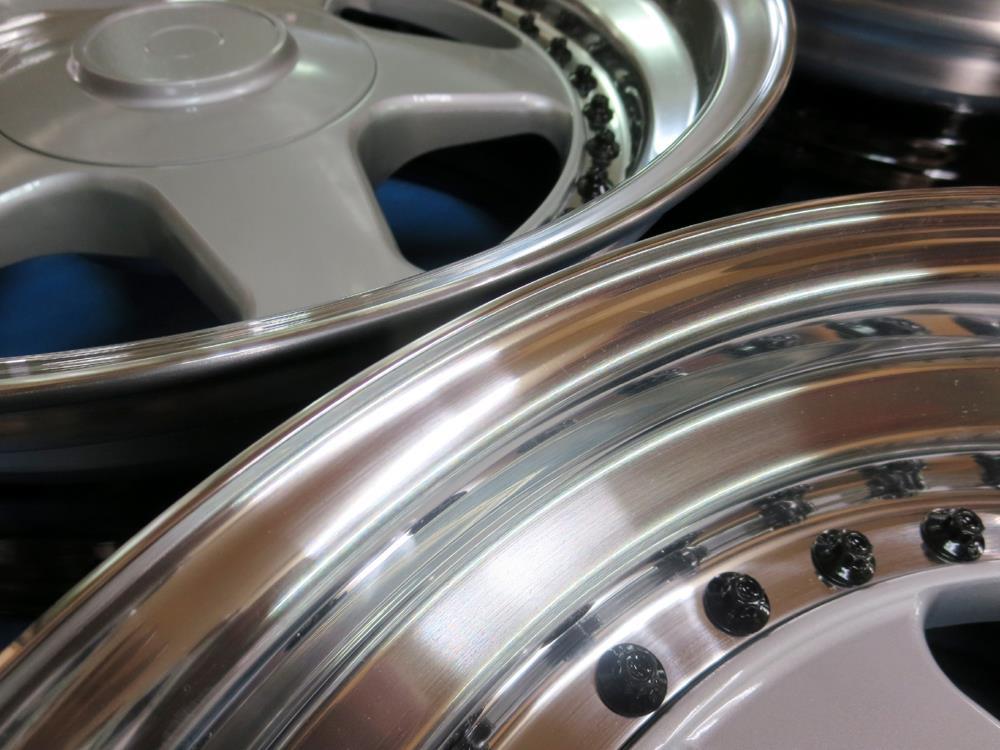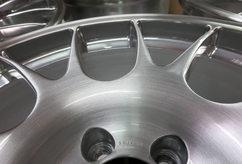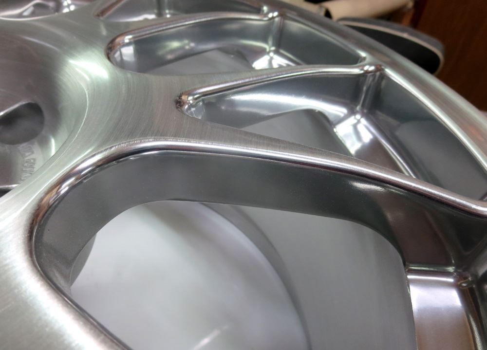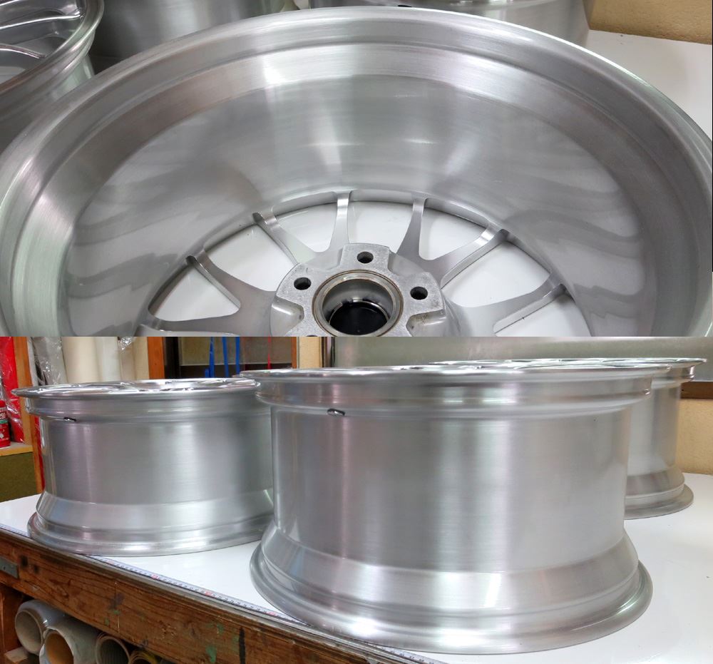 フルポリッシュからのブラッシュドやキャンディーカラーはホイール本体をまずテカテカに光らして光沢を透かした手の込んだ特殊な工法ですのでハンド研磨からバフ仕上げしてバレル研摩を通さないとこの表現は出来ません。