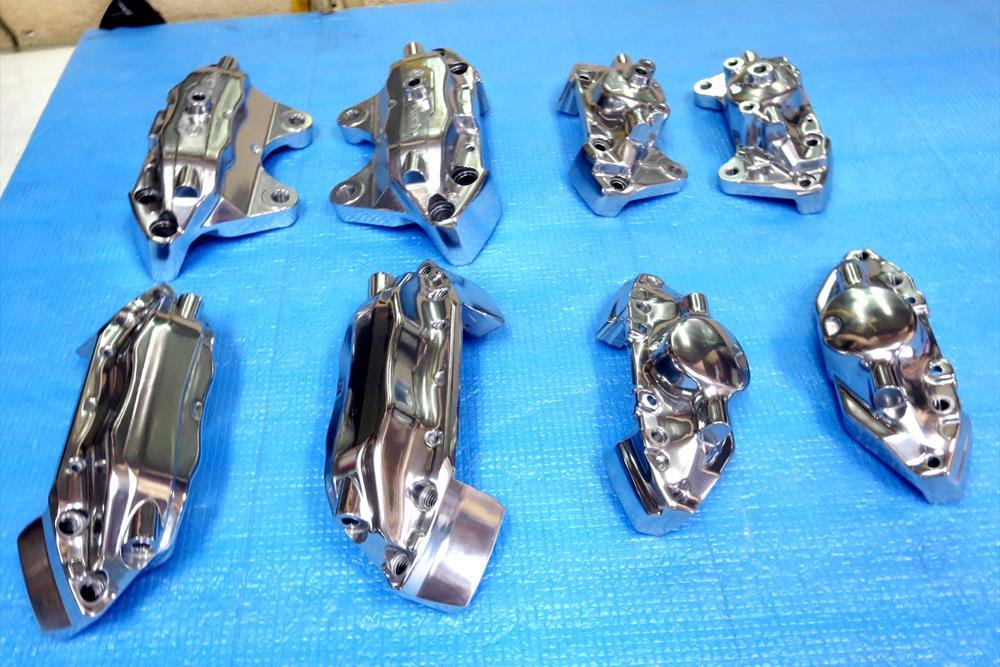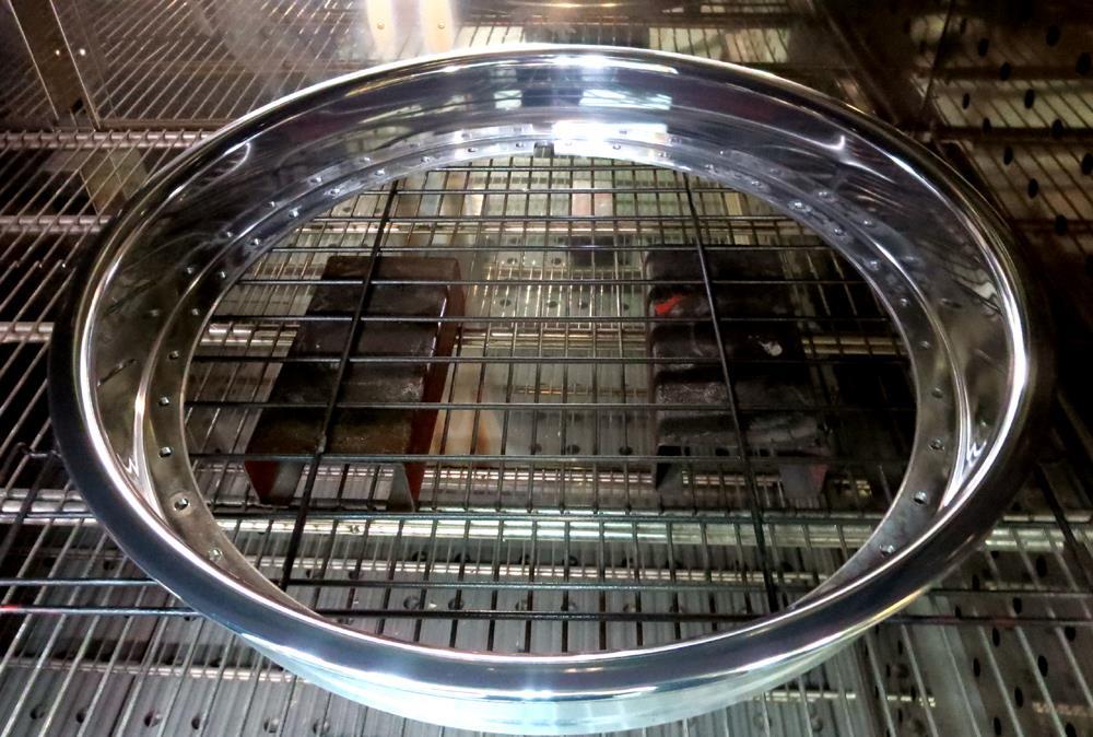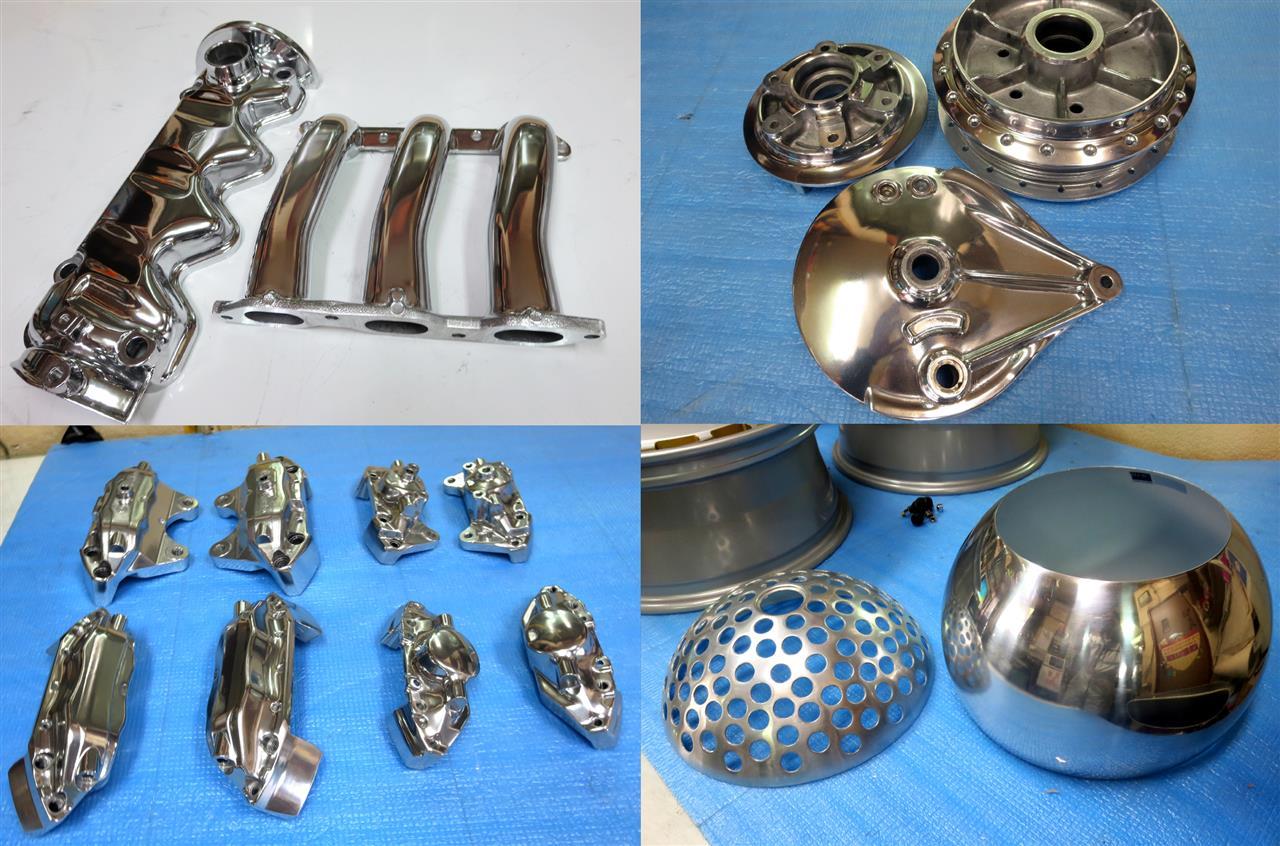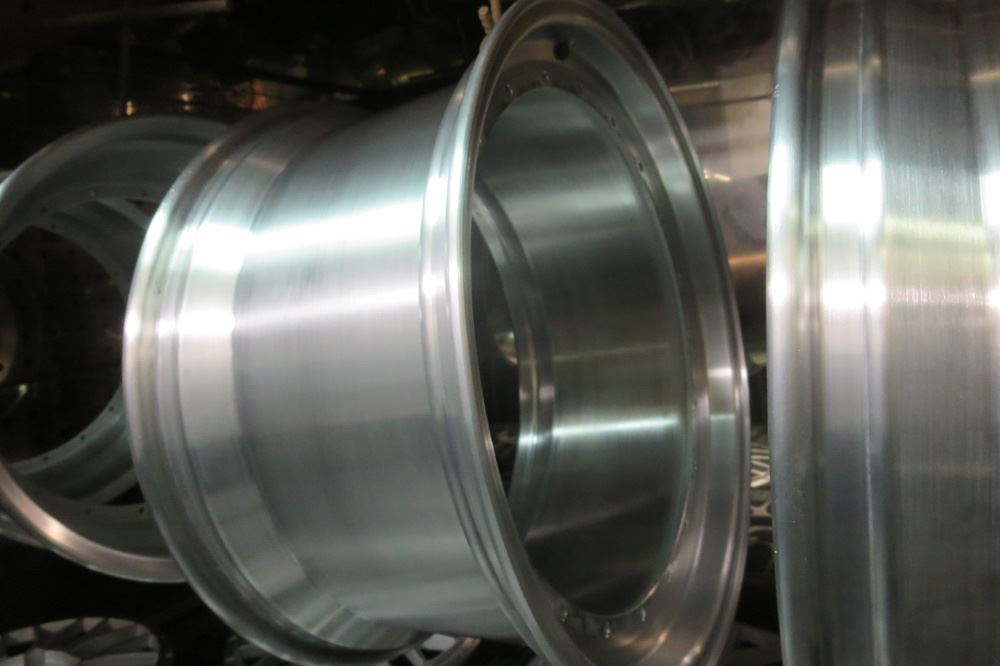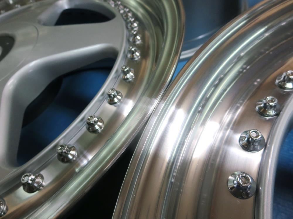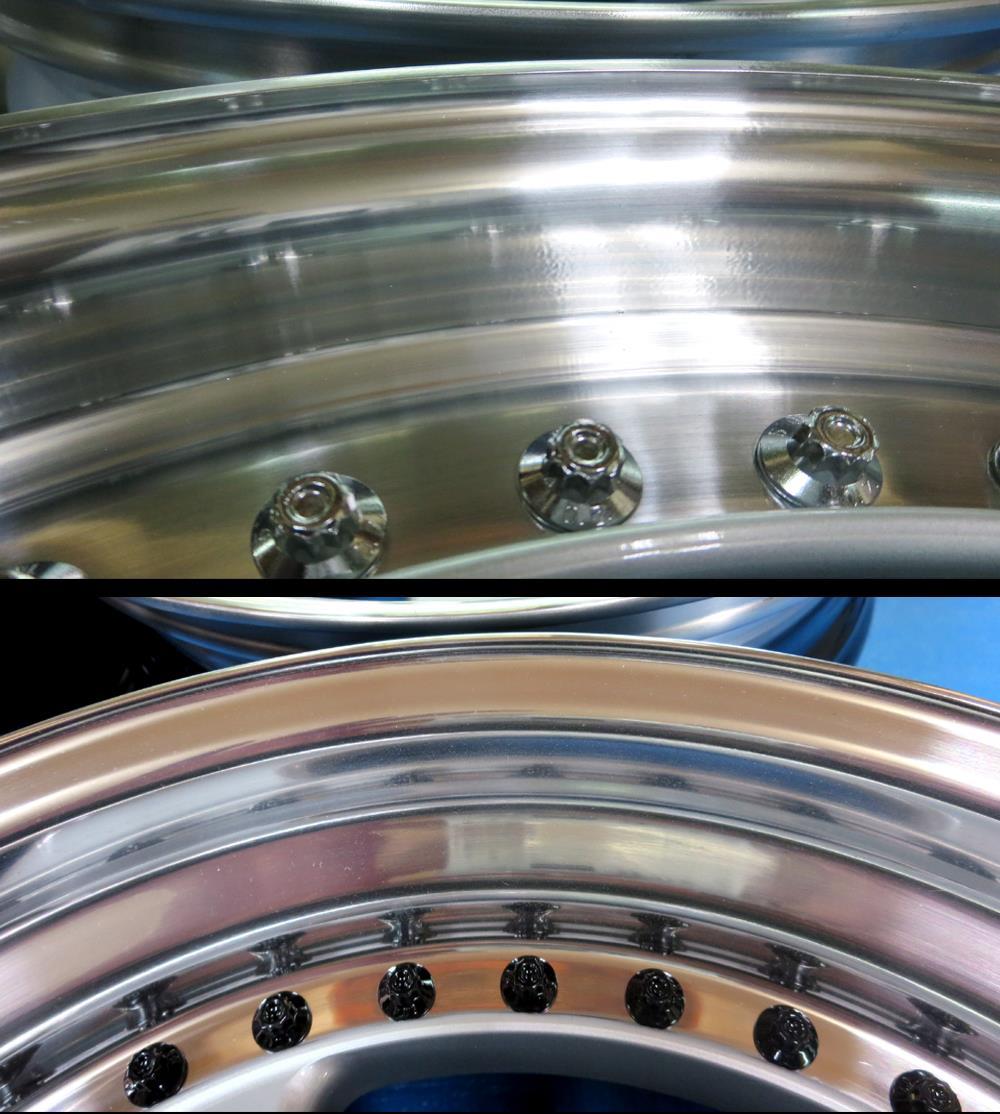 フルポリッシュからのブラッシュドやキャンディーカラーはホイール本体をまずテカテカに光らして光沢を透かした手の込んだ特殊な工法ですのでハンド研磨からバフ仕上げしてバレル研摩を通さないとこの表現は出来ません。