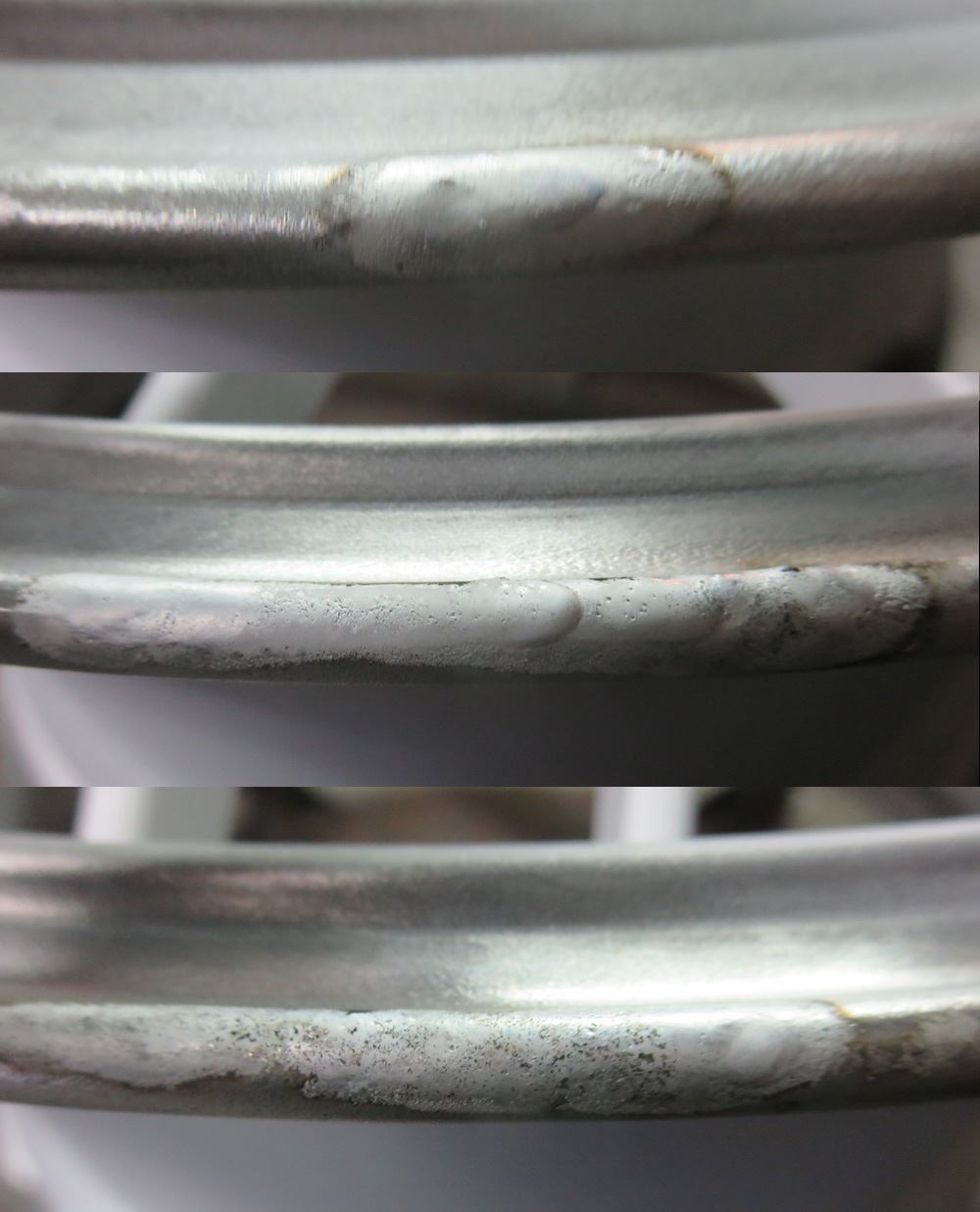 ガリ傷への肉盛溶接・・アウトリムがカラー塗装ならパテ埋めで誤魔化し出来ますがポリッシュにしますので誤魔化しが効きませんのでここが修理技術の腕の見せ所でも有ります。