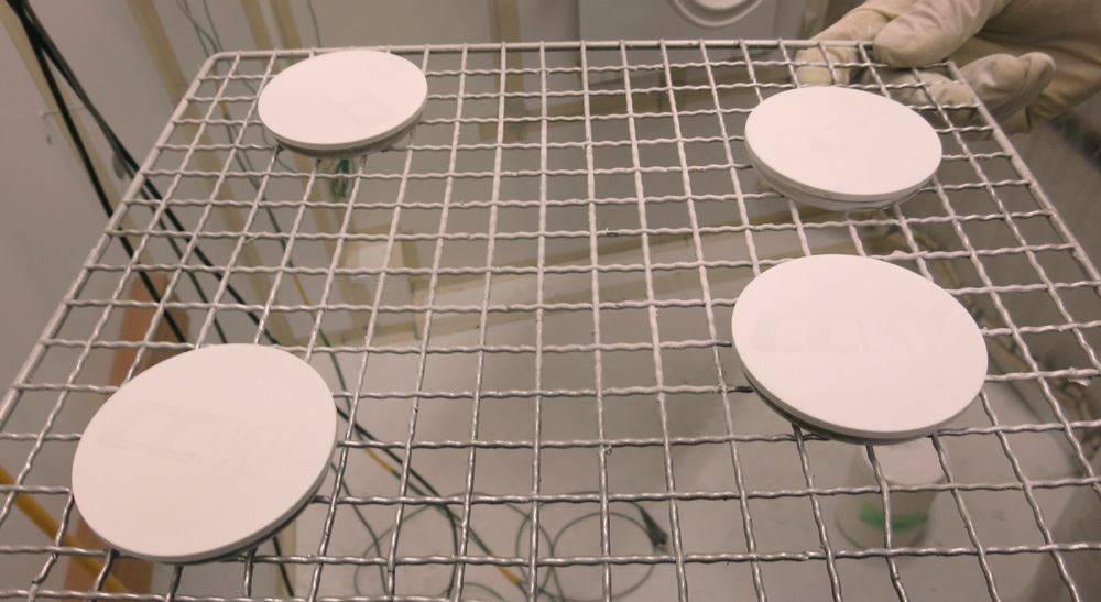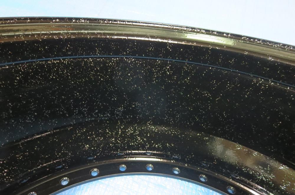 一般的な溶剤塗装は焼き付け温度が80℃前後のため使用中にホイールは熱を持ち50℃前後で溶剤塗膜が柔らかくなりパットカスや異物が熱で柔らかくなった塗膜に刺さり付着していくら洗っても取れなくなります。