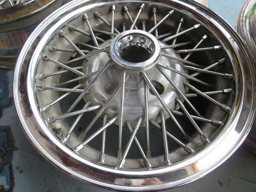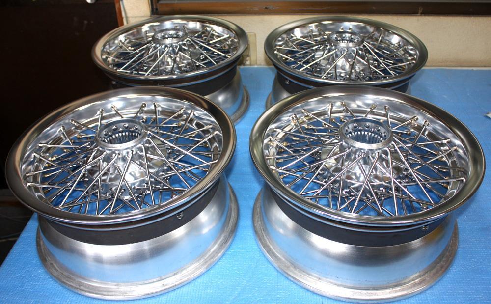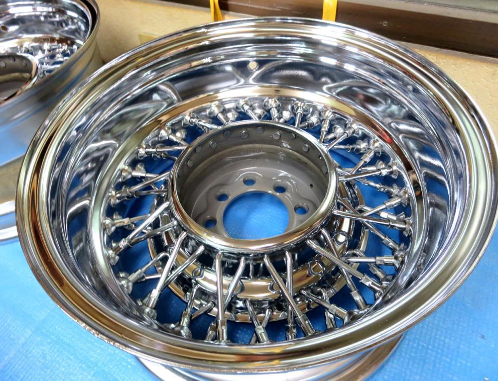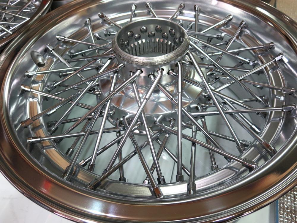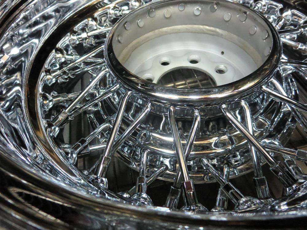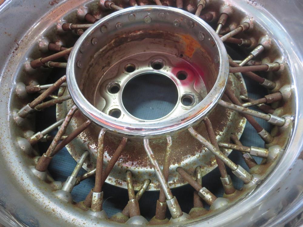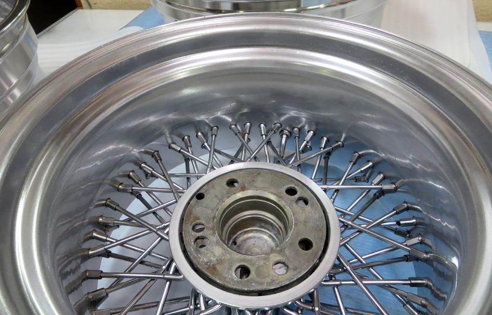 再メッキが出来ない複雑な構造のワイヤーホイールの錆び取りから研磨出来るリペアー再生としてはこれ以上の方法は無い画期的な研磨工法が当社独自のバレル研摩です。※バイクのワイヤーホイールもバレル研磨可能です。