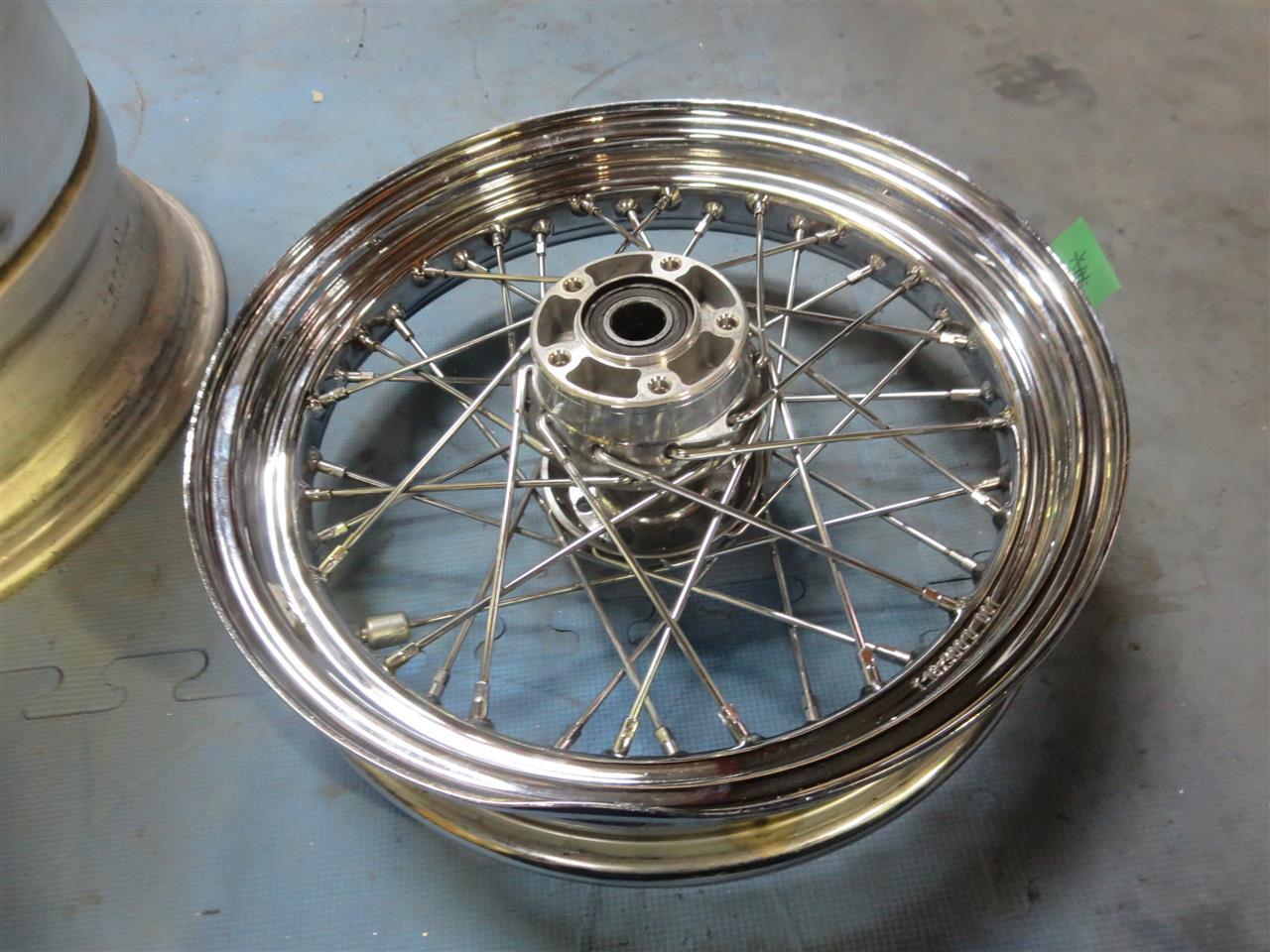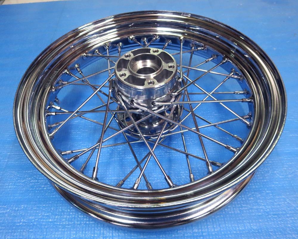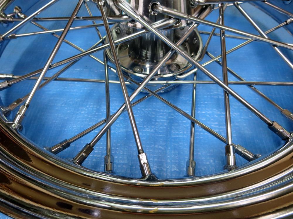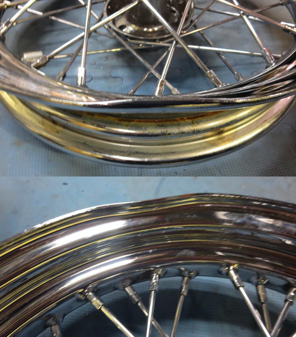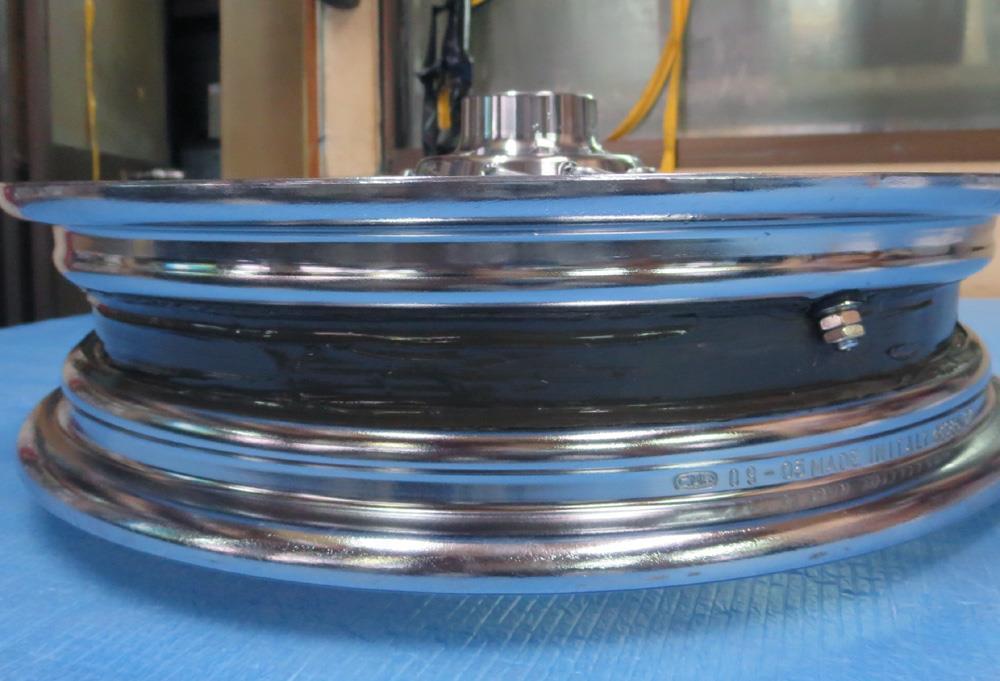 兵庫県のお客様・・・ハーレー用の鉄メッキワイヤーホイールの曲り有りです。バレル研磨からパウダークリアーしてチューブレスにします。