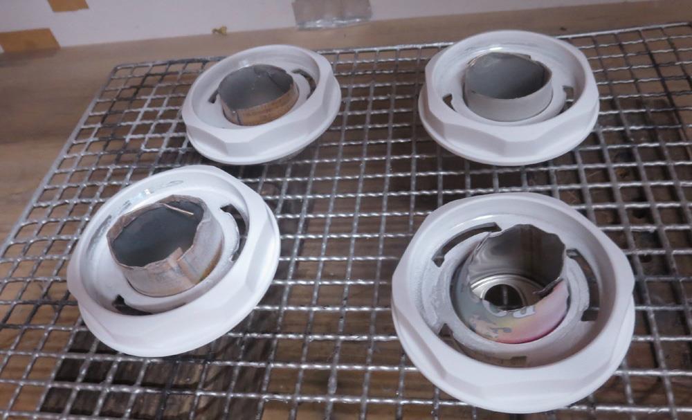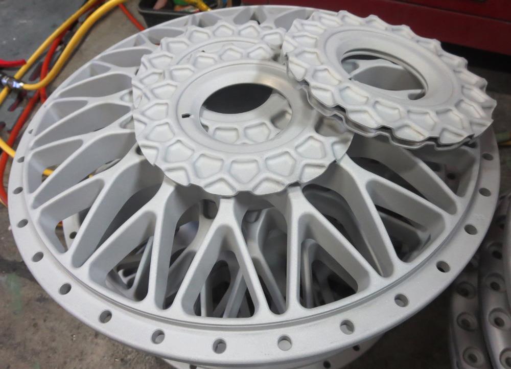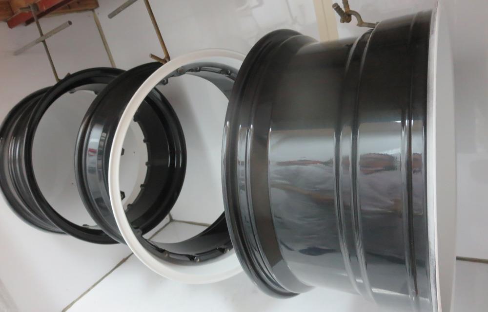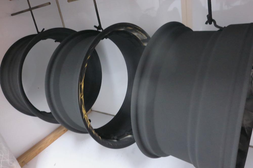 先塗りのパウダーグロスブラックを剥ぎながらアウトリムを磨いてアウトリムの2コート目パウダークリアー静電噴射!