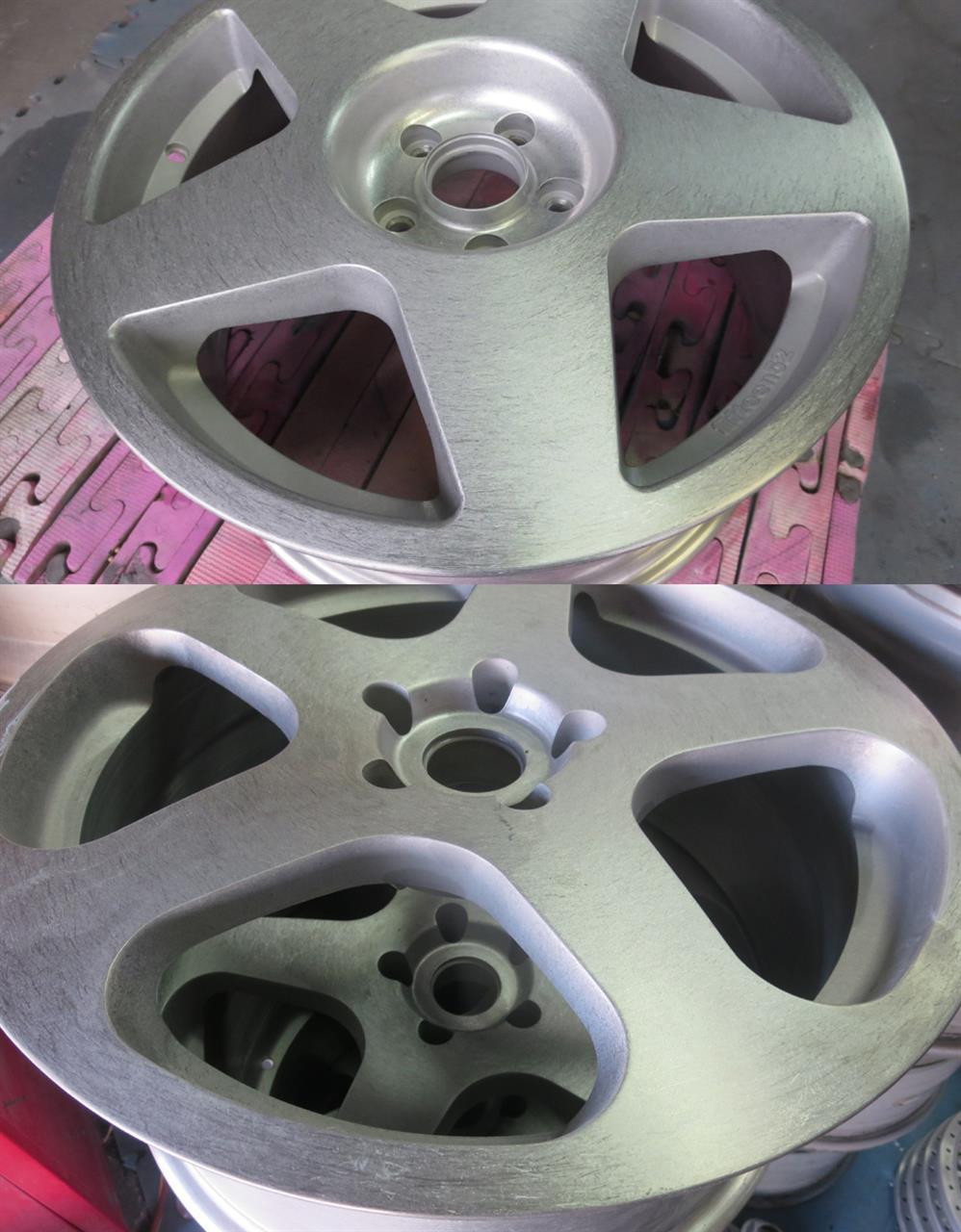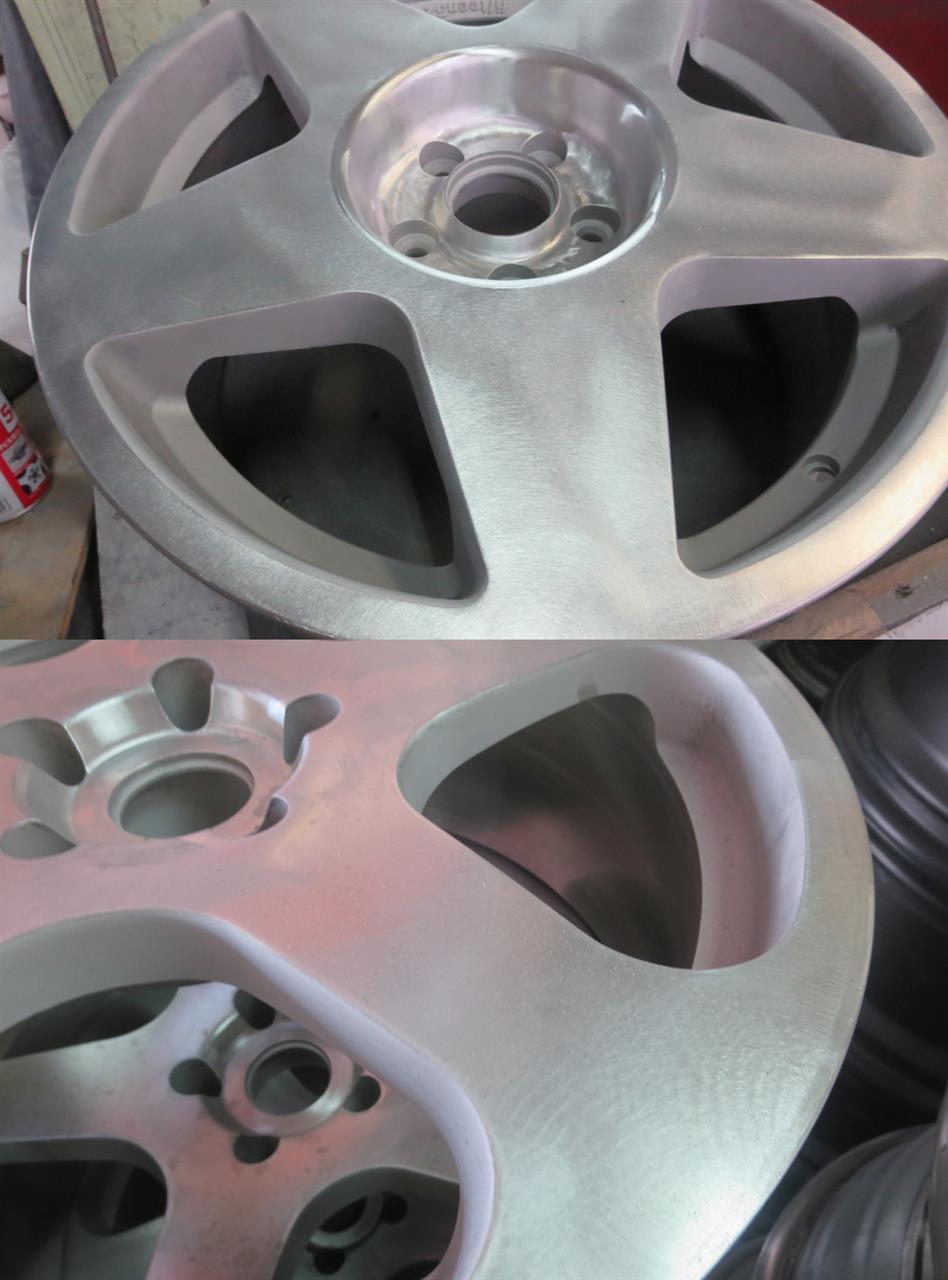 ※バレル研磨が出来ない場合はスポークサイド窓部のゆず肌はウェットブラストで白濁したままの処置か、色を付ける場合はパウダーカラー(黒やガンメタ)を先塗りして天面をブラッシュドしますのでパウダー2コートとなり料金もその分UPします。