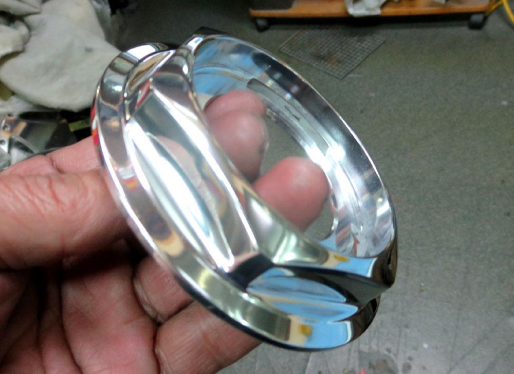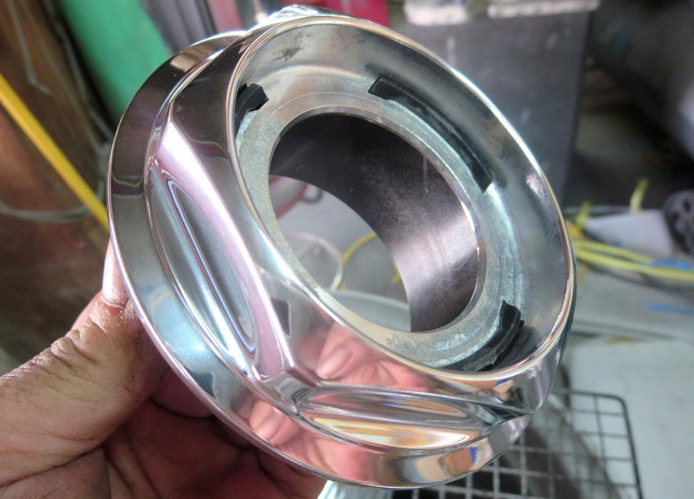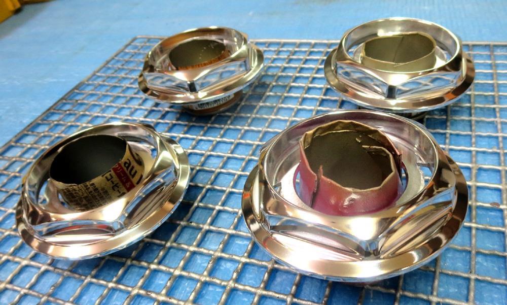プラ樹脂製のメッキキャップは銅板蒸着の樹脂メッキのため赤茶げた金属銅板はフラットに面出し研磨が出来ません。