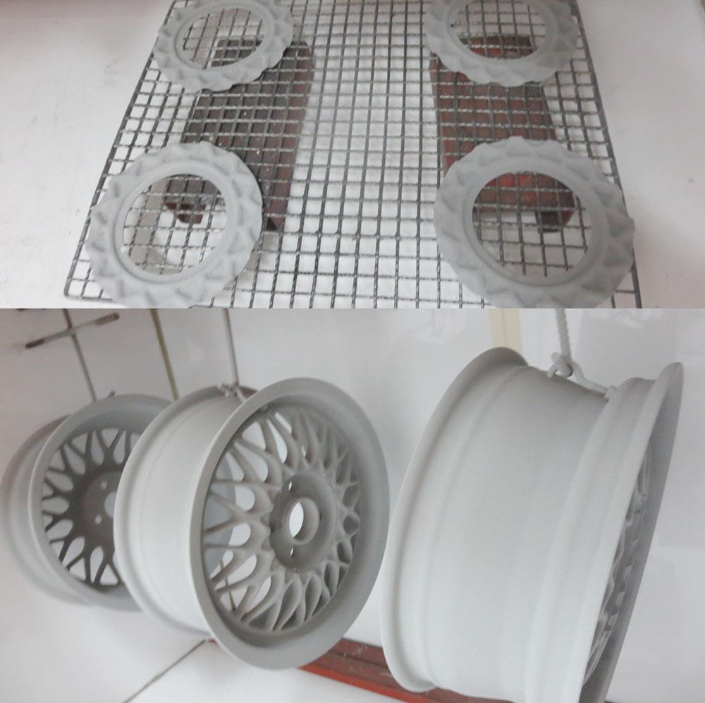 スポークサイド窓部のゆず肌はバレル研磨により鈍い銀光沢になりパウダースモークブラック丸塗りで窓部はDBKの様な表現になりますので先塗りのパウダーカラーは不要となりその分お安くなります。