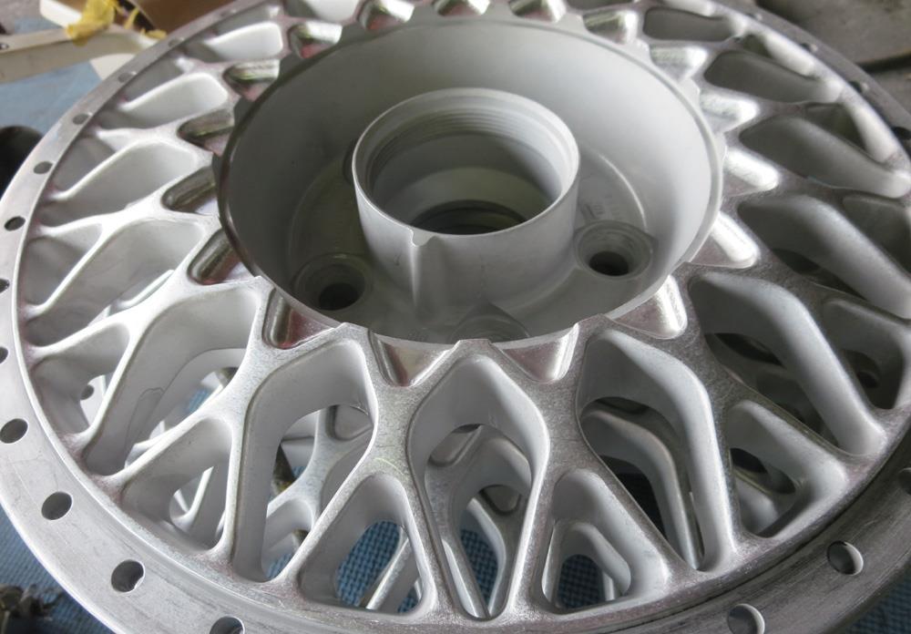 ディスクのDBKはそのままでリムだけポリッシュしてDBK-Pの予定でしたがディスクの剥げ腐食など塗装状態が悪かったため剥離から再塗装して新たなDBK-Pも一案有りでしたが、イベント出品も有りそれなら既製品には無いカスタムで個性を主張した当社一押し自慢のバレル研磨から黒薄めのパウダースモークブラックに急遽変更です。