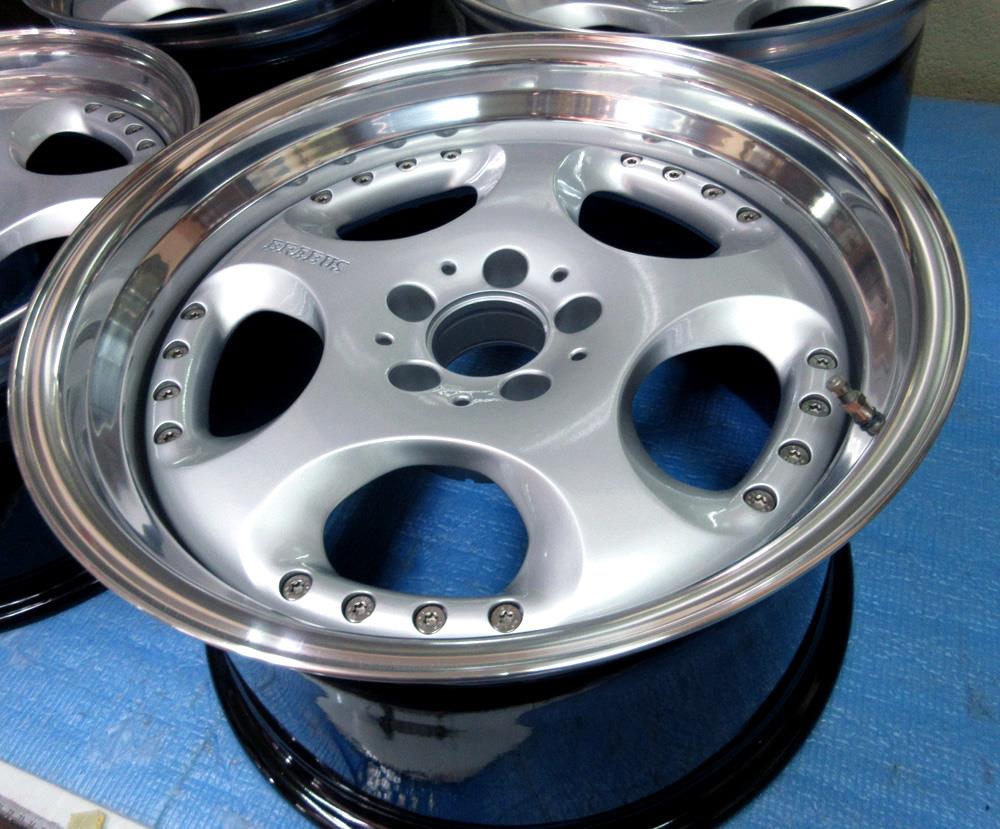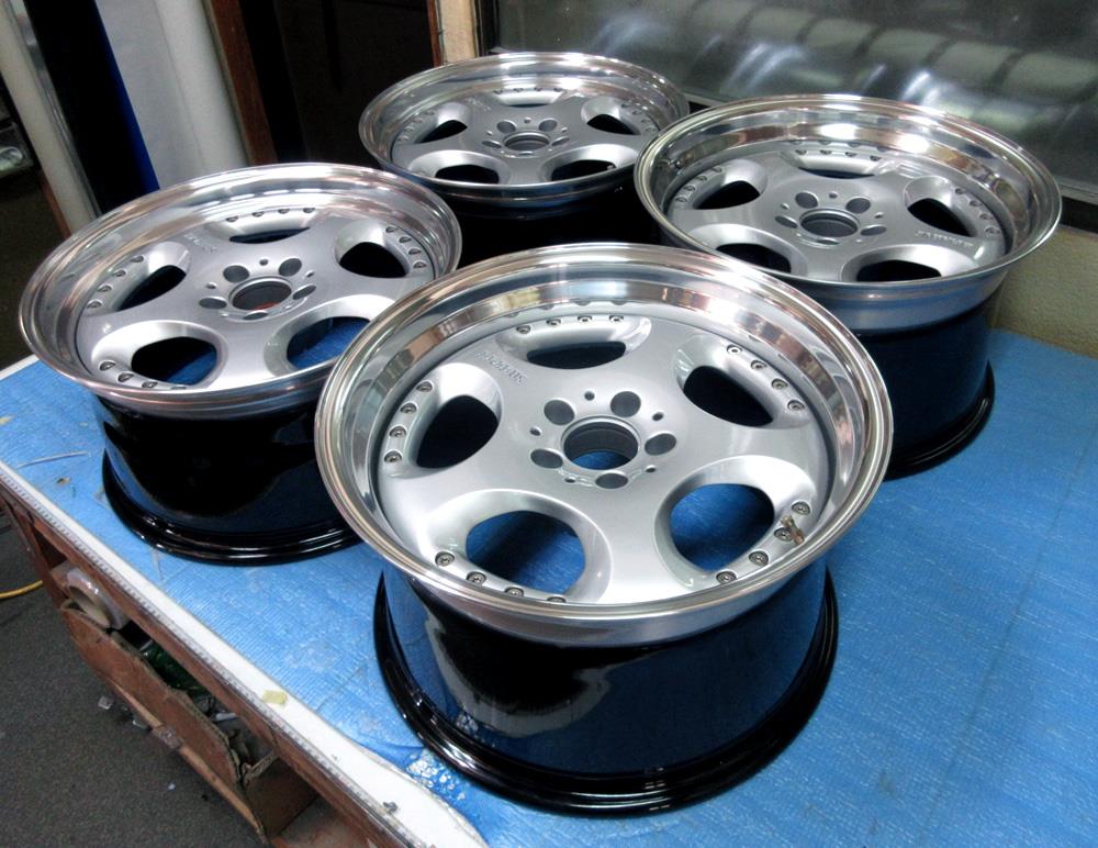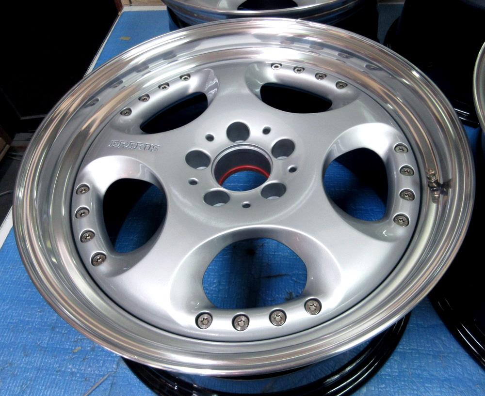 ブラバスもBBS-RSやOZフッツーラと同じ構造の3Psですので普段通りの施工ですが、アウトリム2枚を深めのリム交換へのリクエストが有り、RSやフッツーラならいくらでも対応可能ですがブラバス用のリムには対応していないため特別に一品物のリム作成からとなりましたので2ヶ月近い時間と手間がかかり何とか上手く行きました。