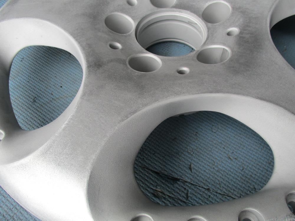 センターディスクの塗装剥離からブラスト研磨して面出しのハンドアクション研磨して溶剤シルバーメタ塗装をします。