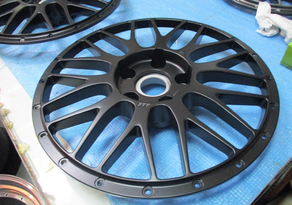 LM限定販売品DBK-Pのリム傷修理ついでに模様替えついでに耐久性をより重視した一品物ワンオフならではのフルパウダーコートによるMB-P(マットブラック&ポリッシュ)からの裏組アンダーディスク仕様にします。