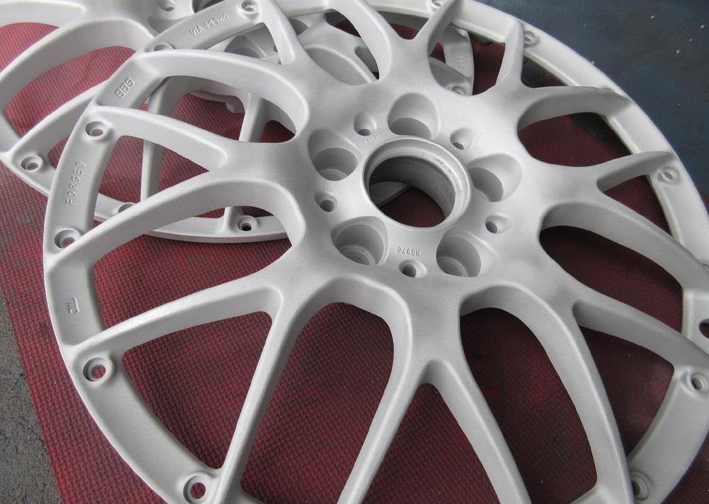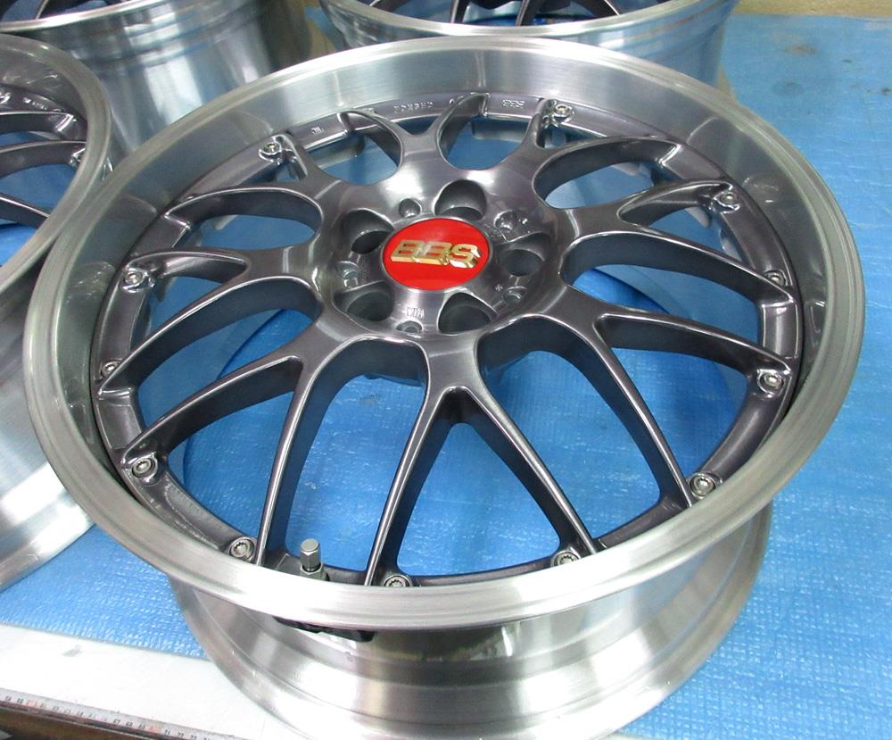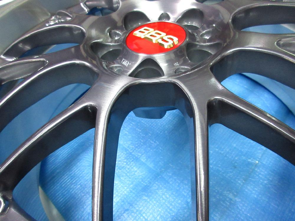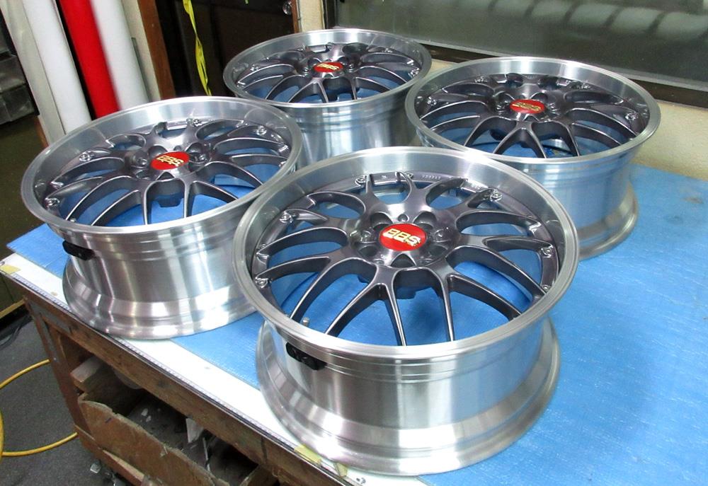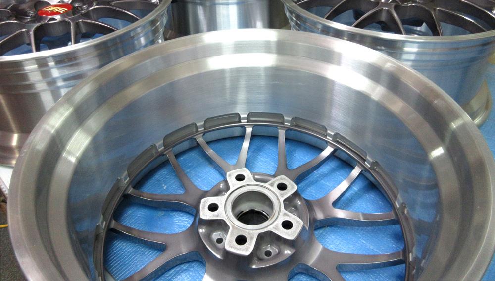 BBS-RS-GTのバレル2次元研磨ベースからブラッシュドして最終コーティングは「パウダークリアー」&「パウダースモークブラック」のフルパウダーコートです。