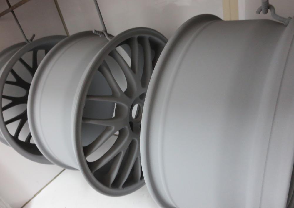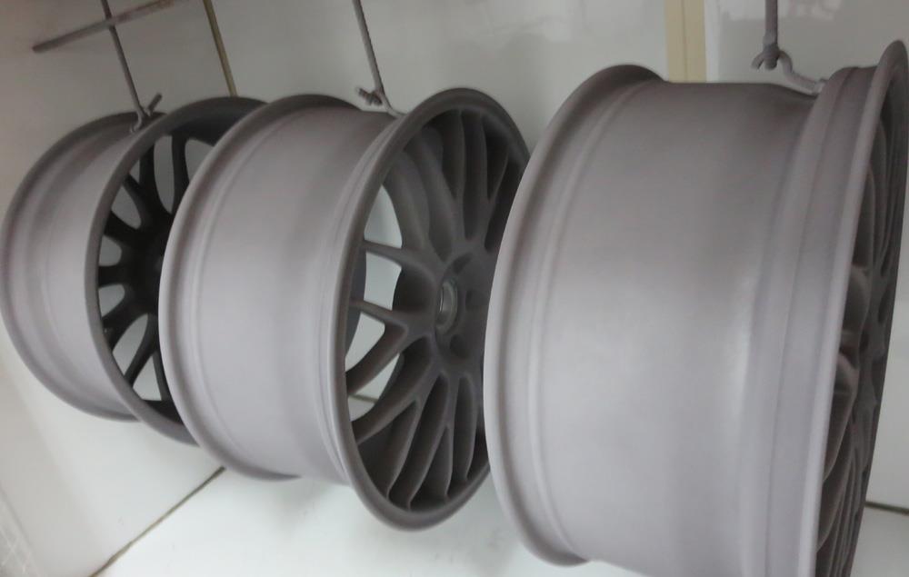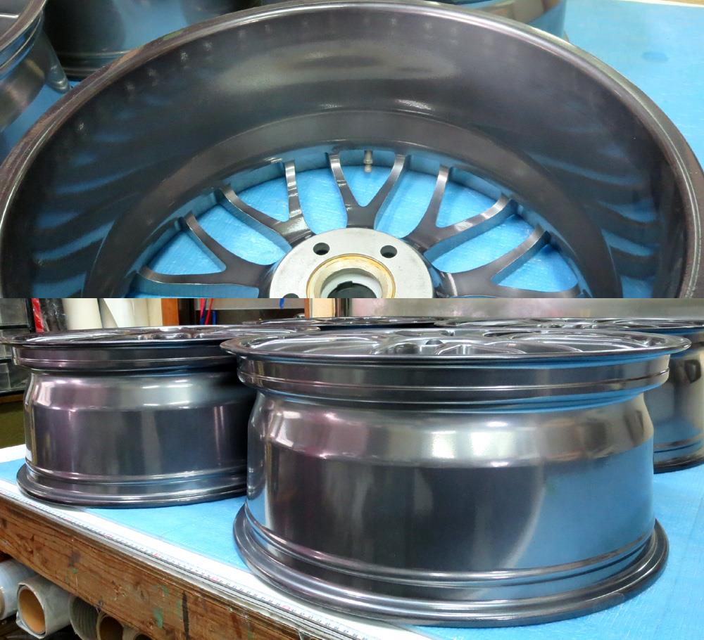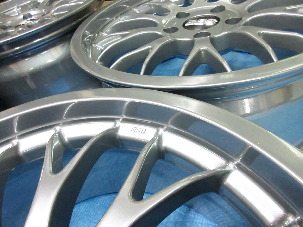 溶剤のハイパー塗装はベースから銀膜添付、トップコートまで4層以上の重ね塗りした高級感有るメタル調塗装となり社外ブランドホイールや高級車の純正ホイールにも多く採用されています。多層塗装のため肌がデリケートで塗装が脆く剥げ易いのが溶剤ハイパー塗装の弱点欠点でも有ります。