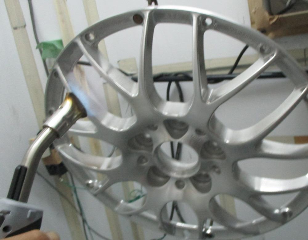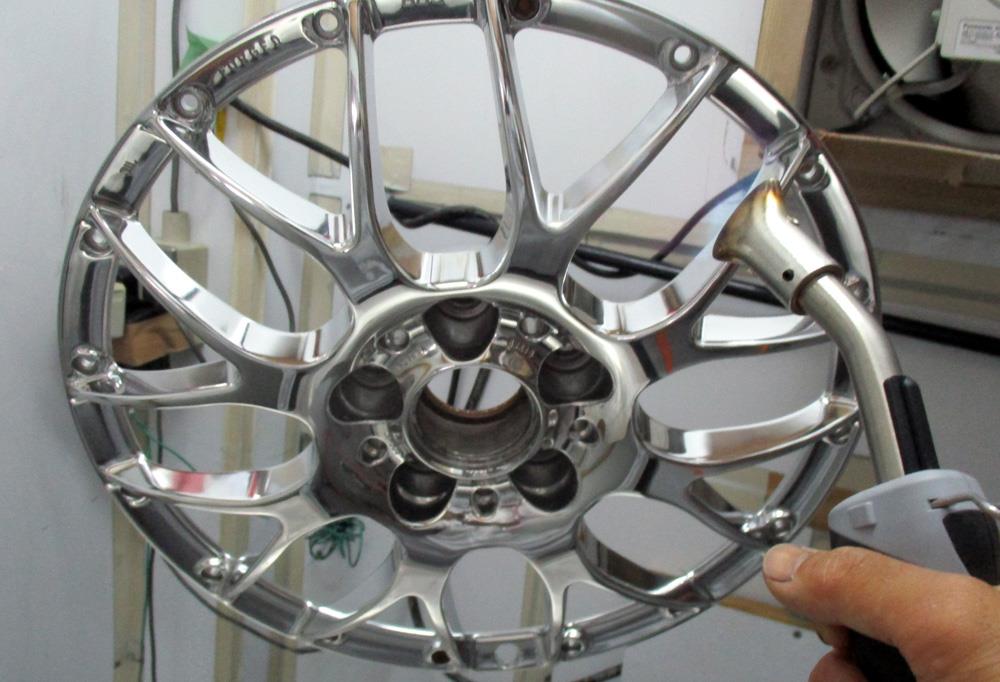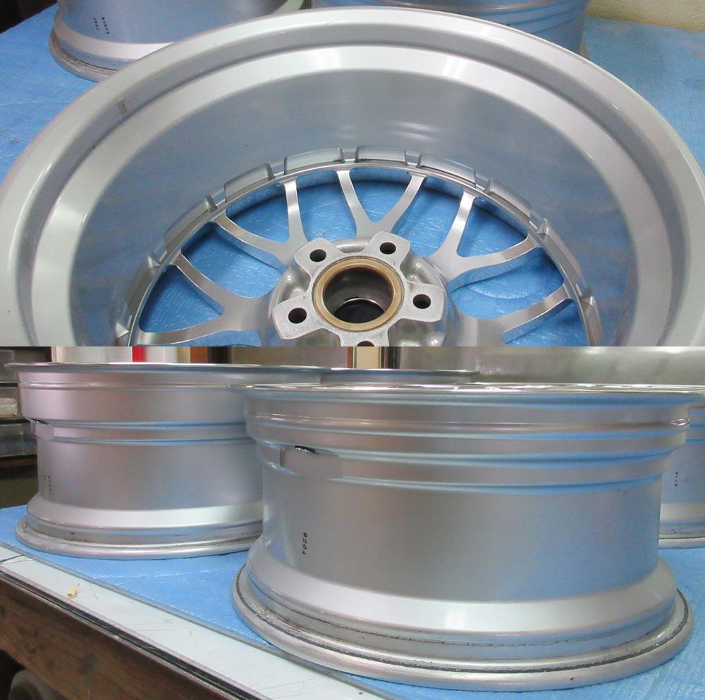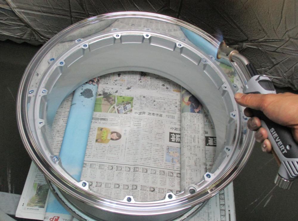 インリムはノータッチつまり元の溶剤シルバー残しのままアウトリムへパウダークリアーを塗れば温度差の違いで元の溶剤シルバーが変色したり発泡したりする恐れが有りますの同条件温度の溶剤クリアーになります。