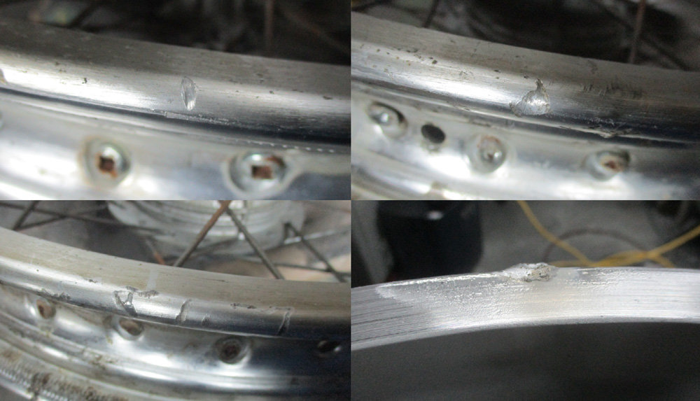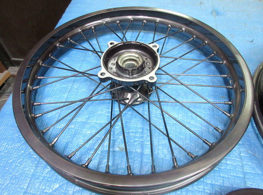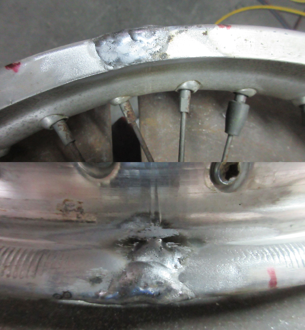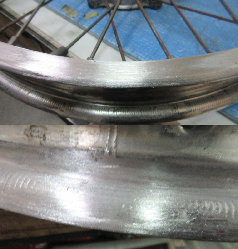 二輪ワイヤーホイールはアルミアルマイトリムですので曲り割れ修理などほぼ問題有りません。