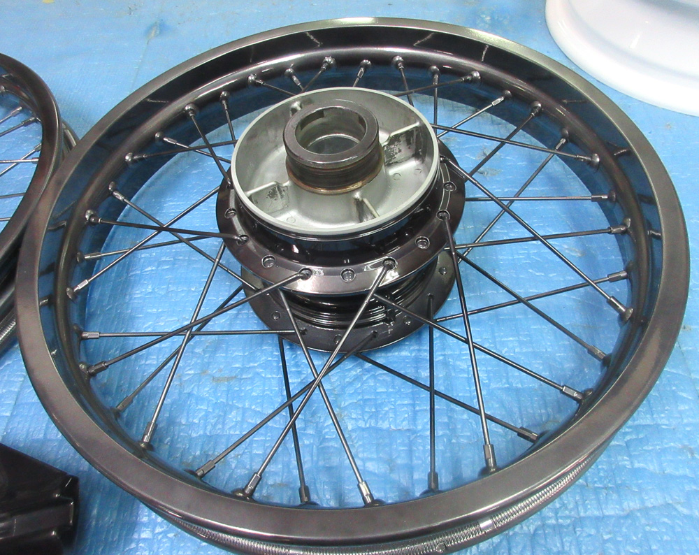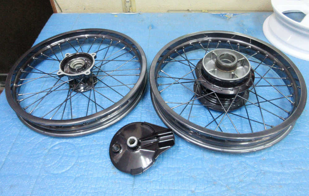 四輪ワイヤーホイールは鉄クロームメッキですので非常に難しい修理ですが何とか修理出来てパウダーグロスブラック再塗装も無事上手く行きました。