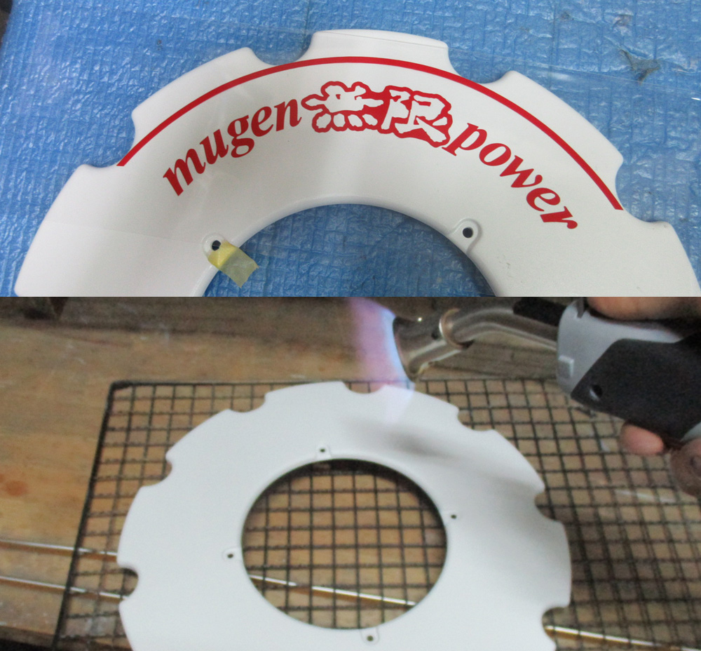 シールサイズの配置確認の試作品を試貼りしてからガスグラスプライマー化学処理からの塗装に入りますがFRP製のカウルはパウダーコート不可のため溶剤ホワイト塗装になります。