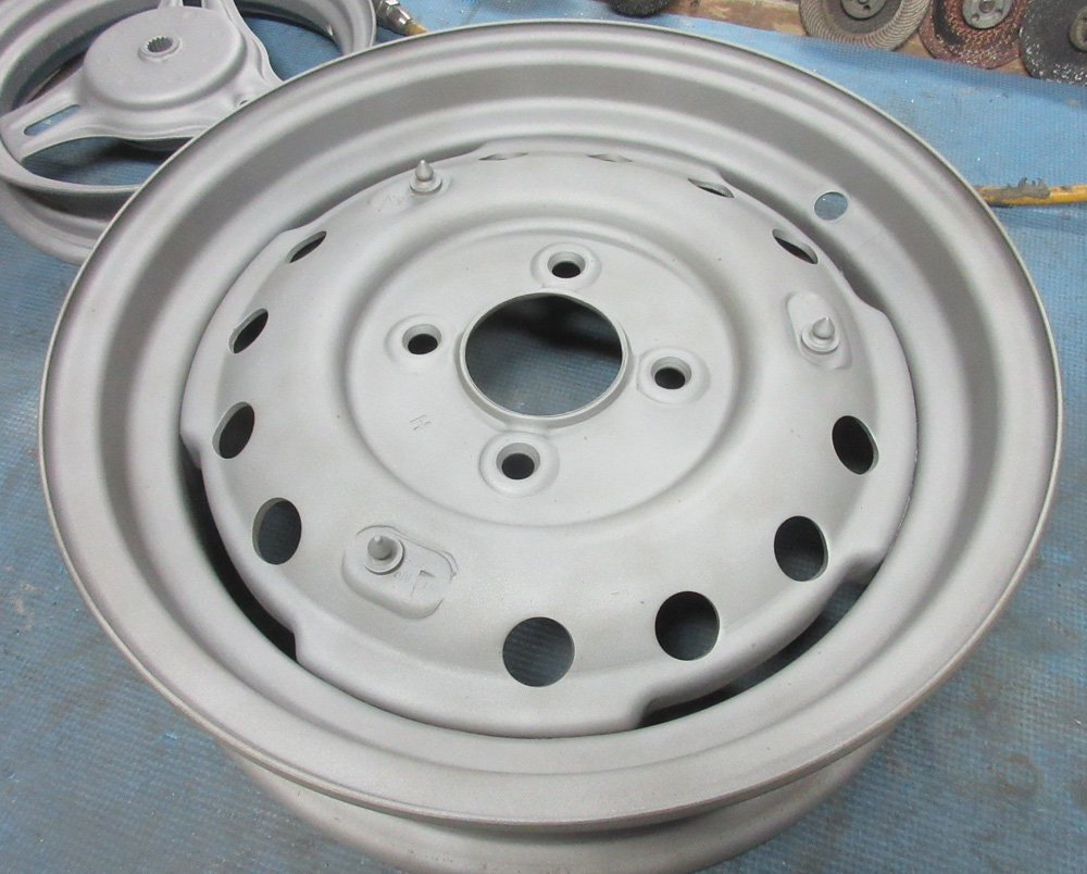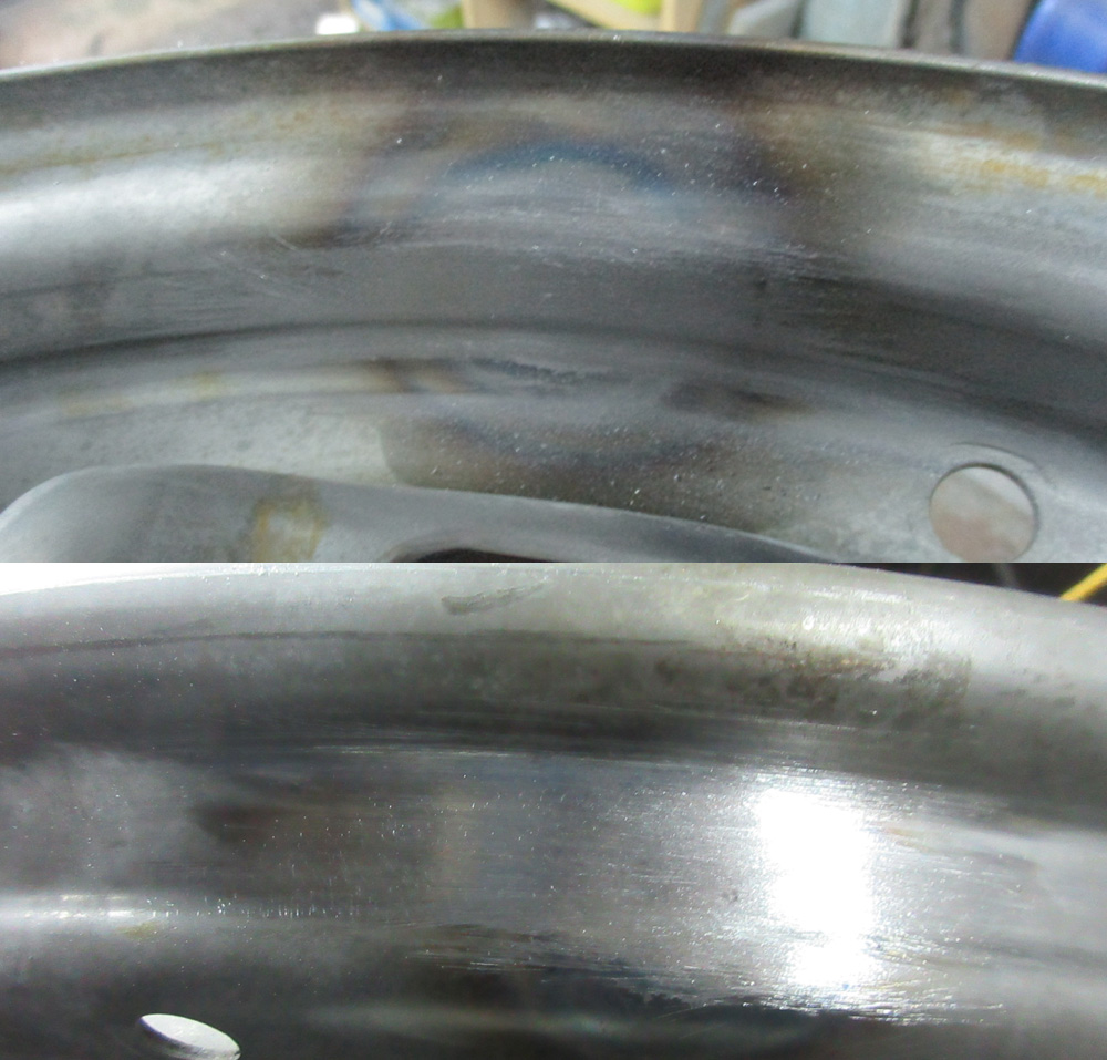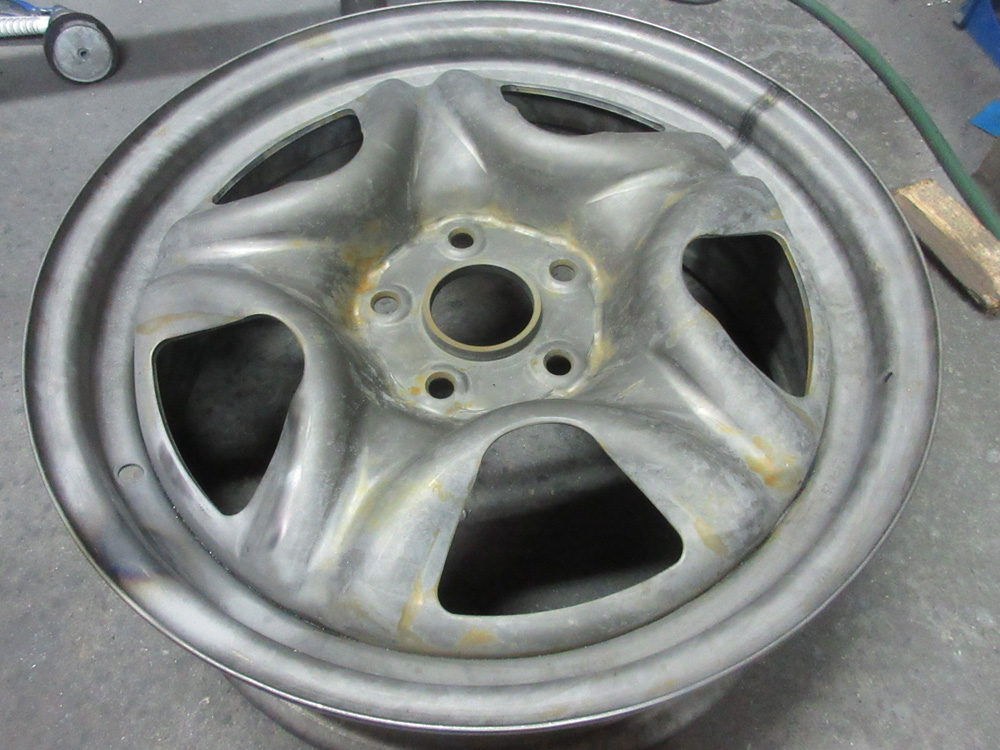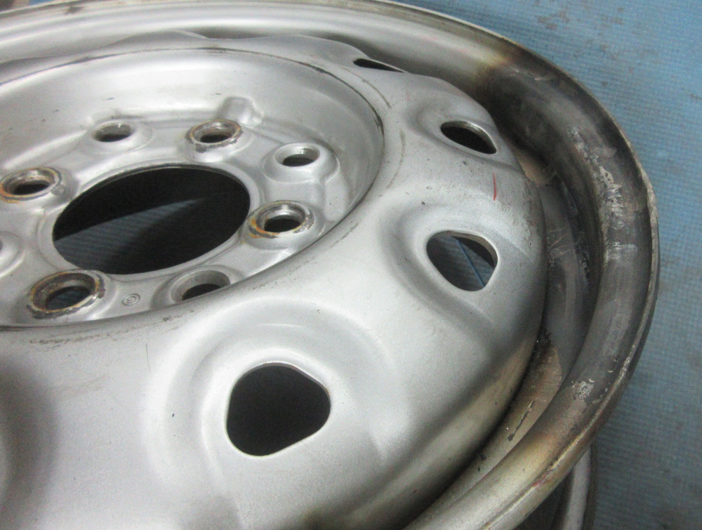 30年前の鉄ホイールですので凸凹曲がってかなり傷んでいますが修理と下処理さえしっかりすれな見事に再生蘇ります。