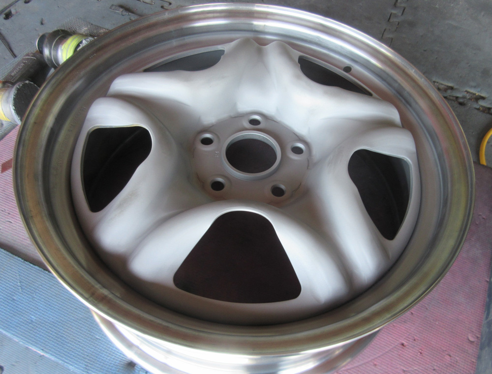 量産新品鉄ホイールの塗装は錆止めレベルの簡易的な溶剤塗装ですが錆び易い鉄ほどワンオフ一品物再塗装ならではパウダーコートがベストな塗装で一般的なガン吹き液体溶剤塗装は行っていません。