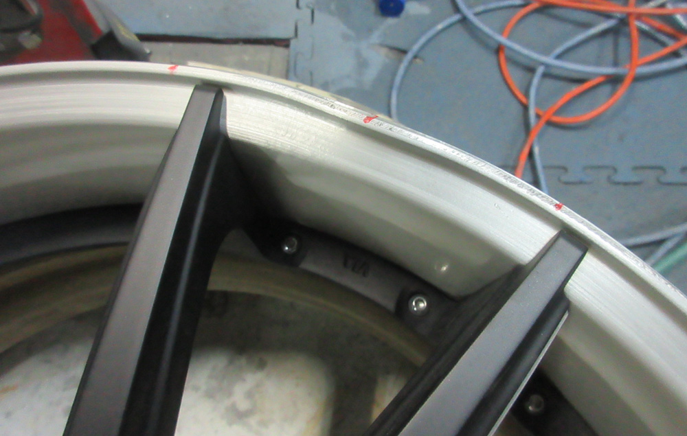 写真左リムフランジ(縦柱)の有る1枚型リムを削り込みすればリムフランジ(縦柱)が薄くなったり低くなりますので外観目視で判断付きますが、写真右AGIOはリムフランジ(縦柱)の無いカールリムですのでリム天井を削り込んでも外観では判断付かないため削り込み修理でもガリ傷が治った様に誤魔化せる簡単な削り込み修理が多い理由です。