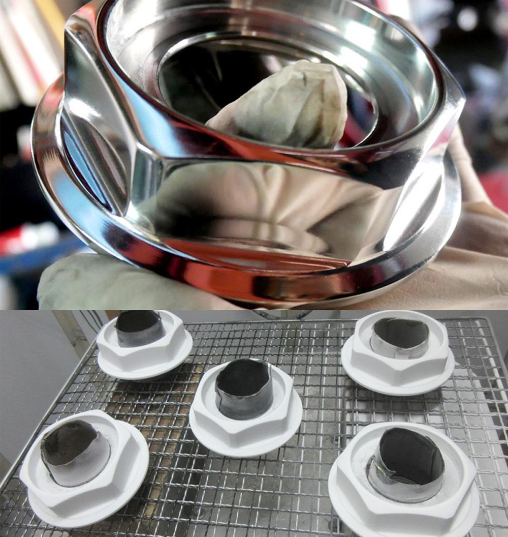 ホール穴周辺はバレル研磨の回転円周が小さい為、外周リムより磨き光沢が甘くなりますのでハンド磨きは3000番手まで追い込まないと光沢が出ません。