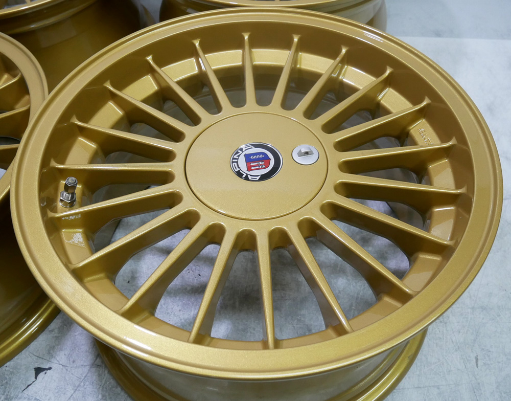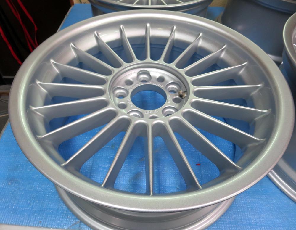 パウダーコートの利点として「密着性・褪色耐UV性・耐熱性・耐錆防止・頑丈肌」など総合的な耐久性や頑丈肌でパットカスが付きにくくガラスコーティング不要でワンオフ一品物ならではの理想的な塗装ですので4本セット再塗装は今時ガン吹き液体溶剤カラー塗装は行っていません。