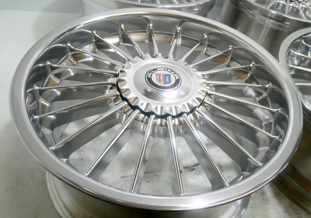 アルミ製センターキャップ付きスポーク線の細いアルピナ(バレル3次元研磨フルポリッシュ+パウダーアクリルクリアー)