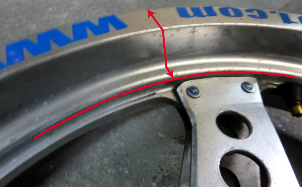 ※二輪ホイールはリム幅が細いため曲りにより反対側が引っ張られ反ってしまいホイール本体が横振れを起こします。さらにタイヤ側への押し込み曲りはエアー漏れはしませんがディスクまで押されるためディスク自体の曲り、横振れ、歪み現象が起きます。