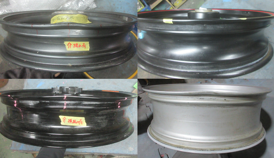 バイク二輪アルミホイール カラー塗装リム曲りガリ傷修理から「修理研磨のみ再塗装無し・修理周辺再塗装・リム研磨全面再塗装・剥離パウダー再塗装」