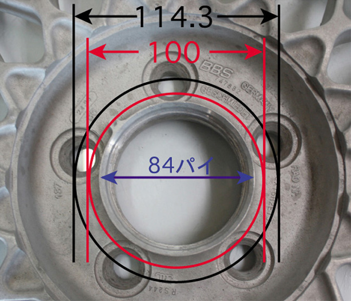 16~17インチRSはセンターボア直径84㎜有りますので100-4H普通にピッチ加工すればセンターボア縦柱に100-4Hピッチ60度テーパー外周が縦柱に干渉します