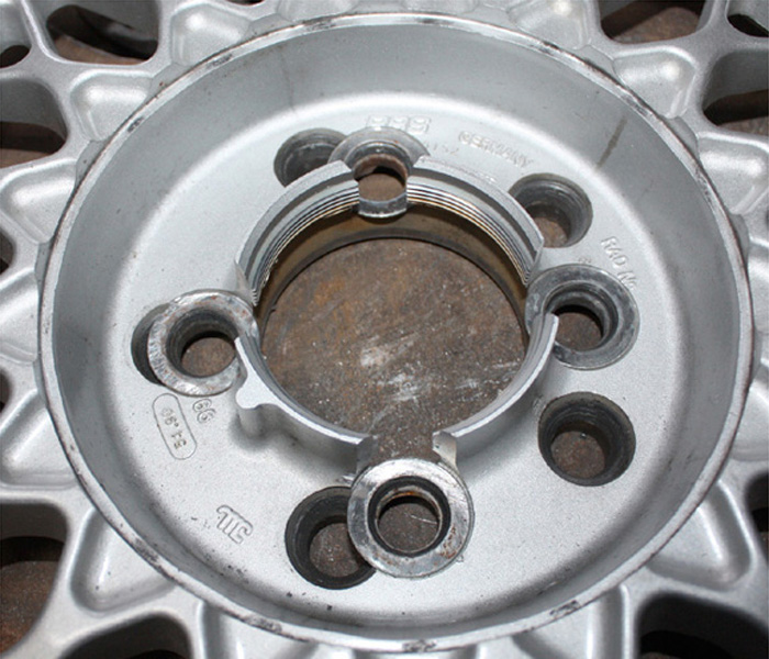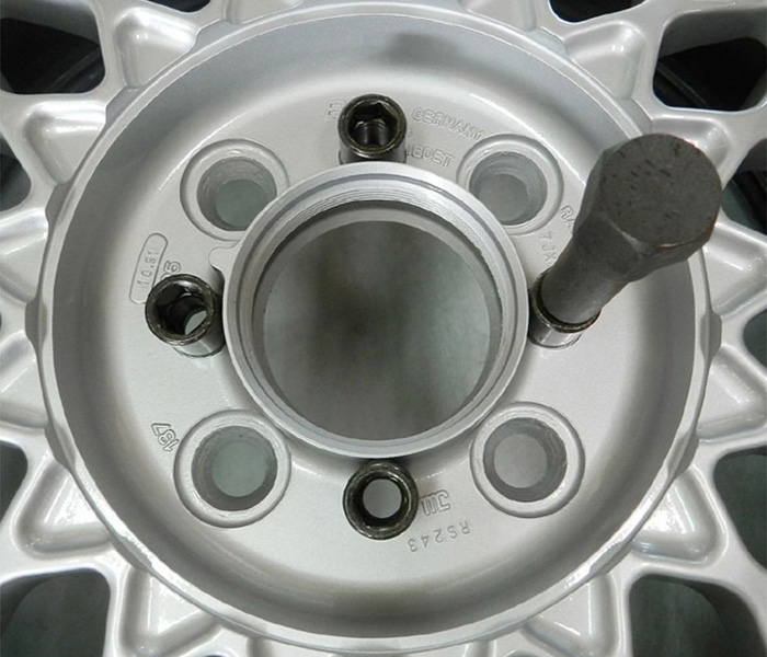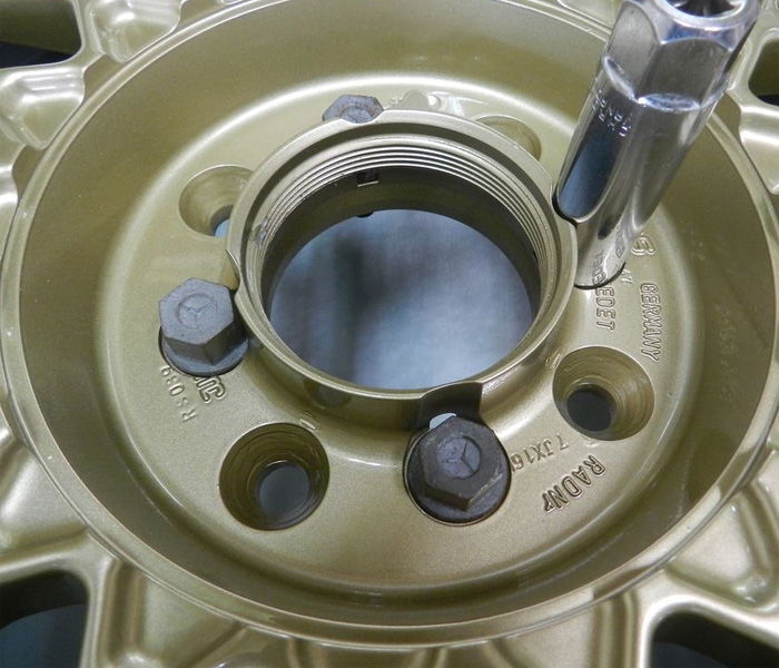 縦柱干渉部を切断された100-4Hピッチ加工ですがこれでは口が開き6角キャップが緩み飛んで無くなりさらにセンターコーン式タイヤバランスも取れなくなる悪い例