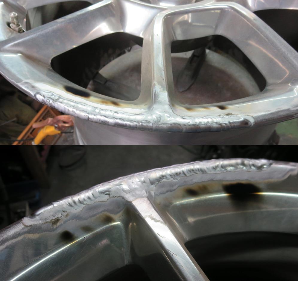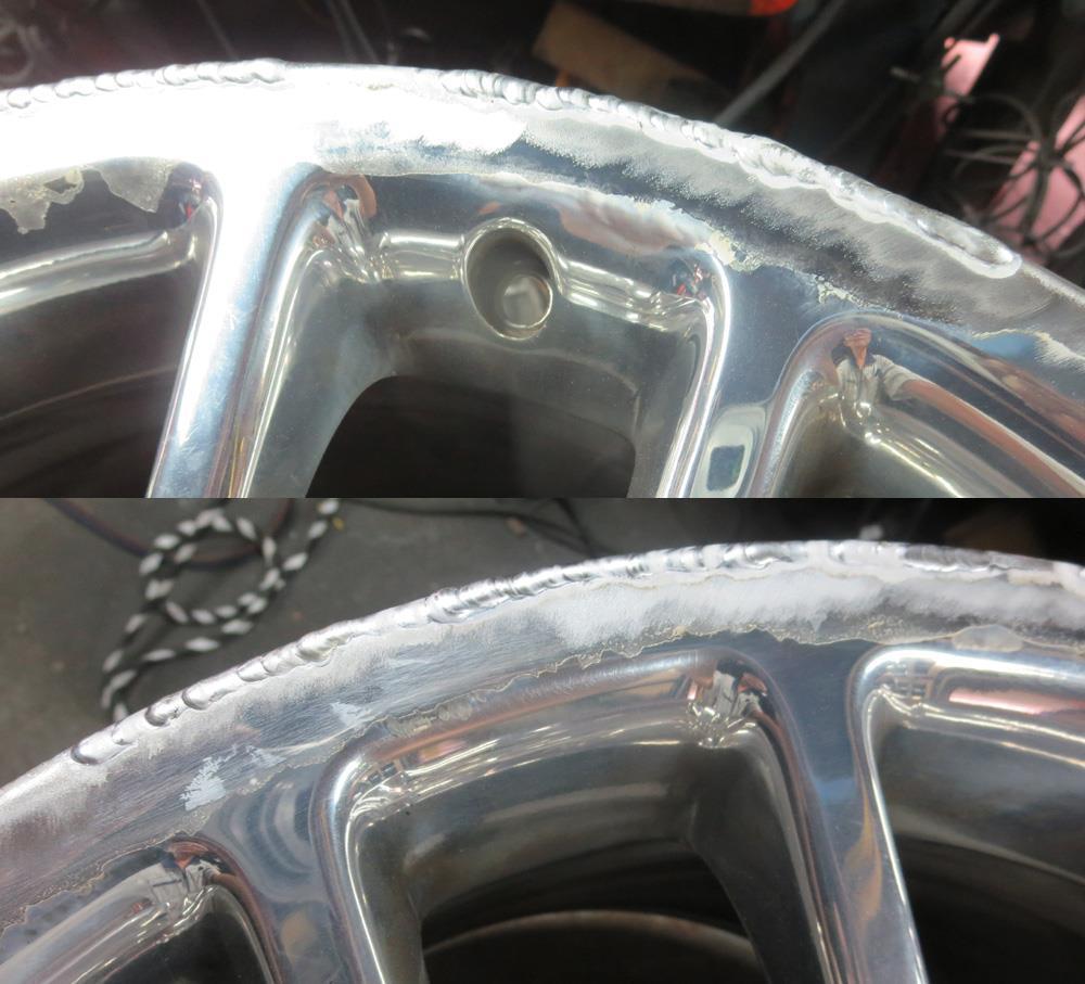 鍛造(FORGED)は加熱加圧するため金属組織が極めて密で空気孔が全く無いため溶接してもピンホールは出ませんが、海外製の鋳造(CAST)ホイール「特に中国製」などは不純物が多く金属組織がスカスカで空気孔が多いための溶接により空気が湧いて出てピンホールがどうしても出て来ます。素材の良し悪しで溶接修理のクオリティーも大きく左右されます。