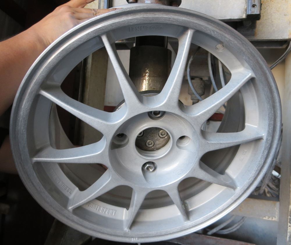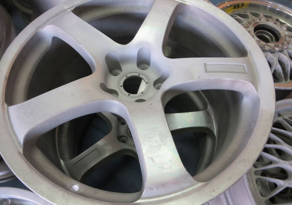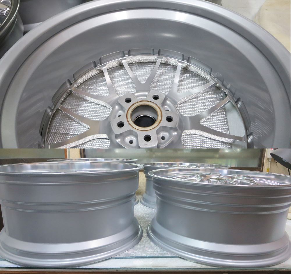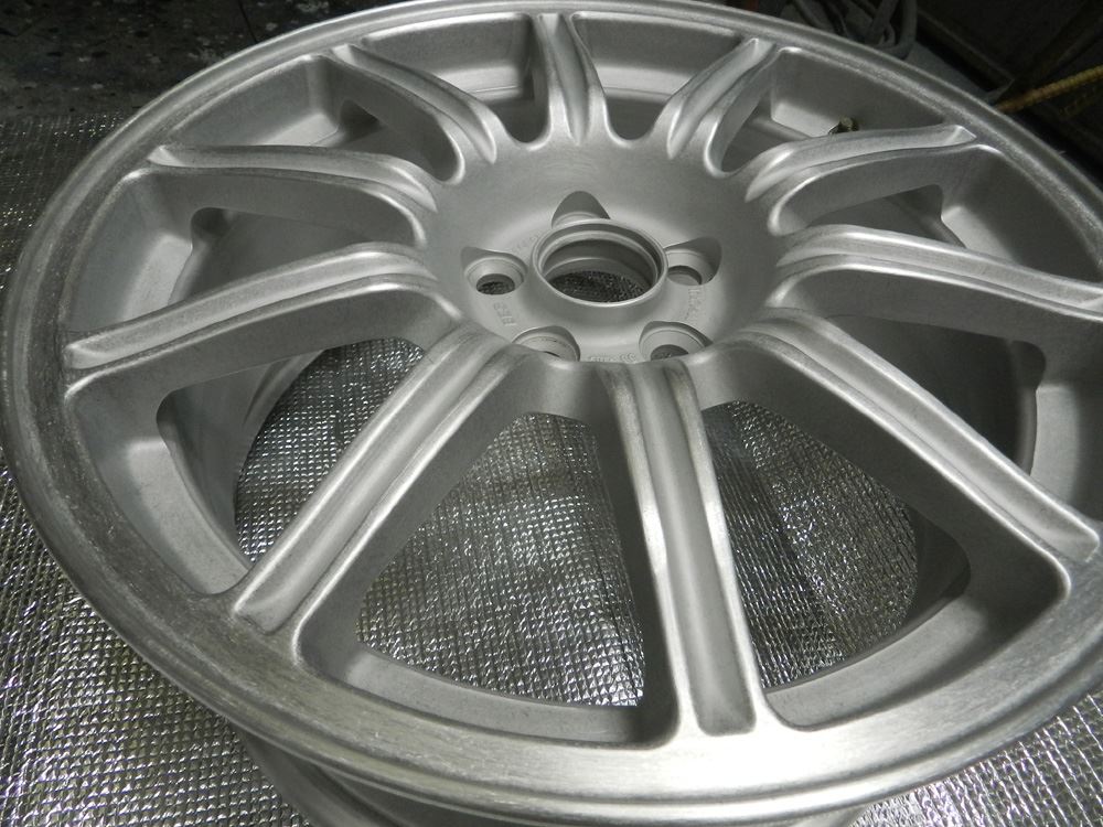①曲り、ガリ傷修理~ ②塗装剥離~ ③ブラスト研磨(ドライ&ウェット)~ ④ディスク部はアクションハンド研磨~ ⑤リム研磨(アウト、インナー、側面リム)~ ⑥丸ごとバレル荒研磨~ ⑦完全脱脂~ ⑧120℃空炊き~ ⑨静電パウダー噴射~ ⑩冷却完成!