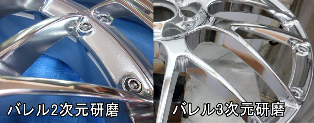 リム~ディスク天面が鏡面バレル研磨になりディスク窓部サイド面は鋳物ゆず肌残しの鈍い銀の光沢にするのがバレル2次元研磨です。