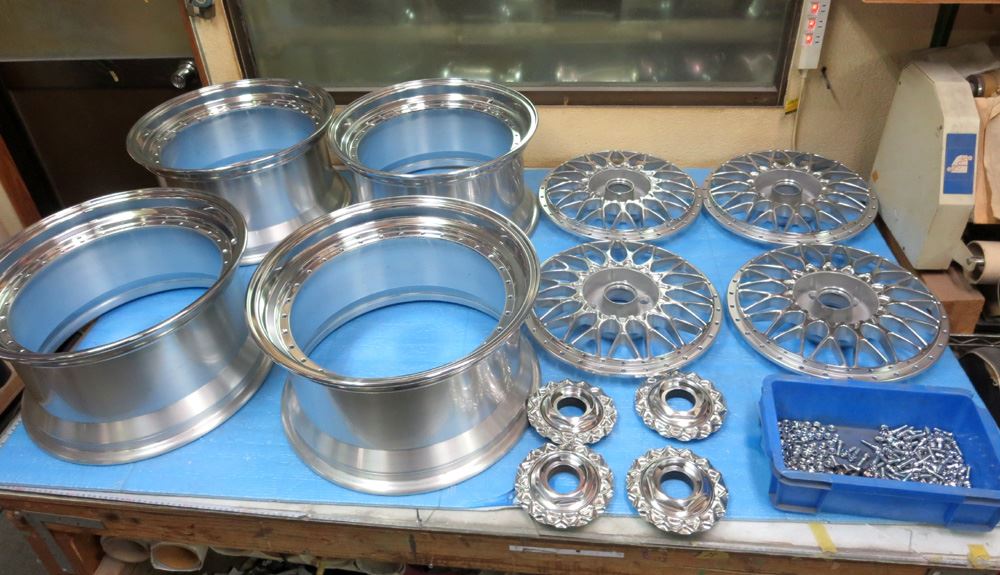 Super-RSは2Psリム本体~センターディスク~メッシュプレート~6角キャップ~ピアスボルトで構成されています。ピアスボルト以外全パーツ個別のバレル研摩フルポリッシュからフルパウダークリアーのフルコースカスタムです。
