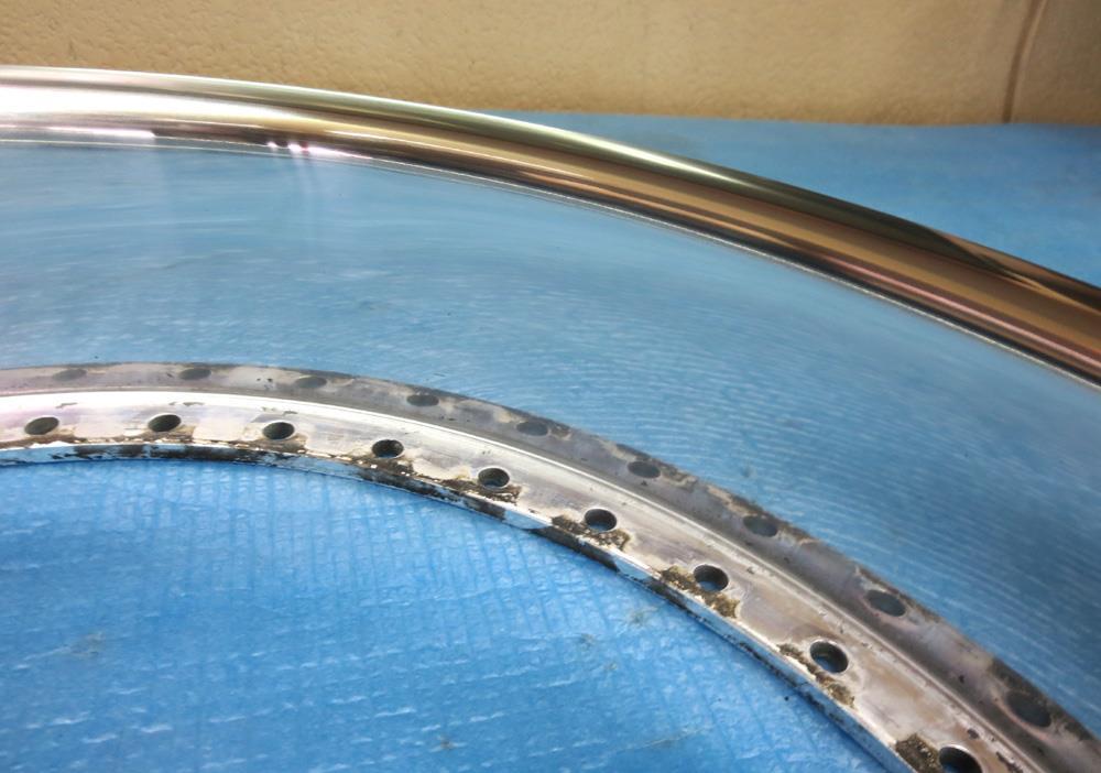 やや曲っていましたので曲り修理後、ヤスリ削りの低い箇所を大きめに肉盛り研磨してリムの肉厚、高さの復元です。