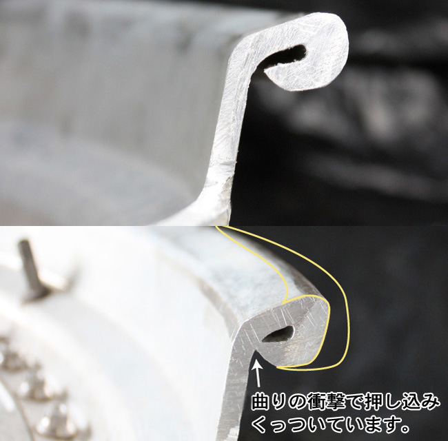このホイールはアウトリムにステンレスジャケットを接着剤で付けてピアスボルトで抑えて有る構造ですが、リム裏からボルト締めして有るモノなど装着方法も様々有ります。