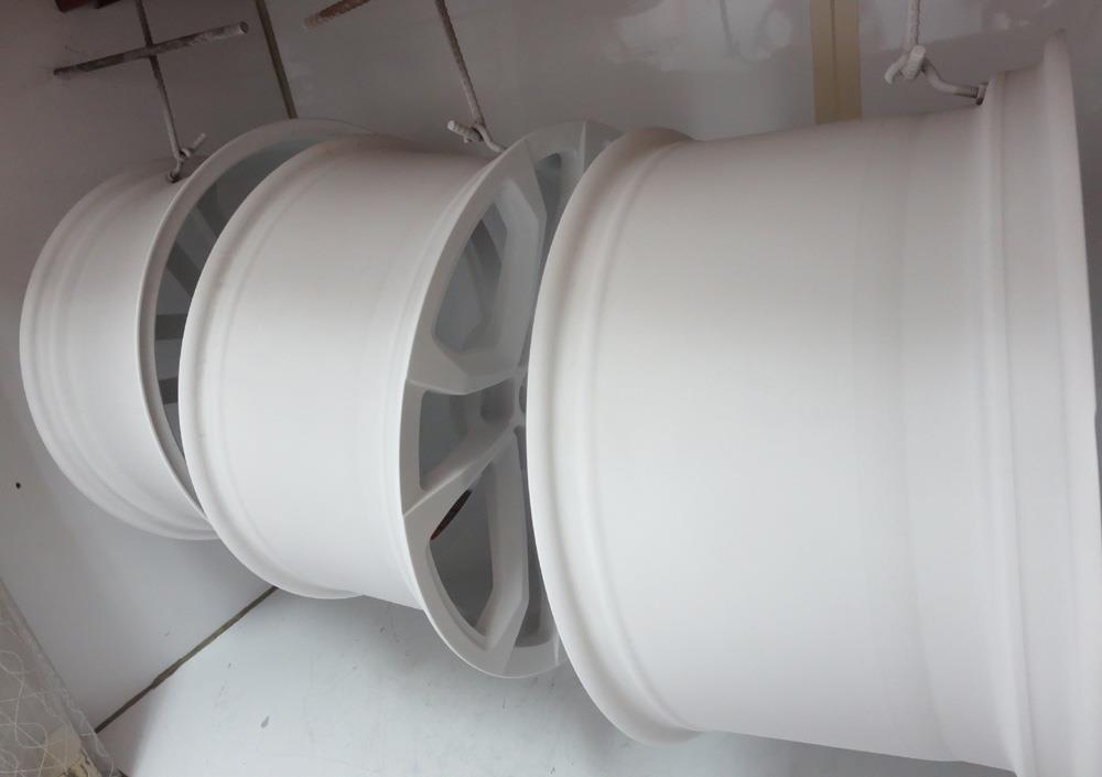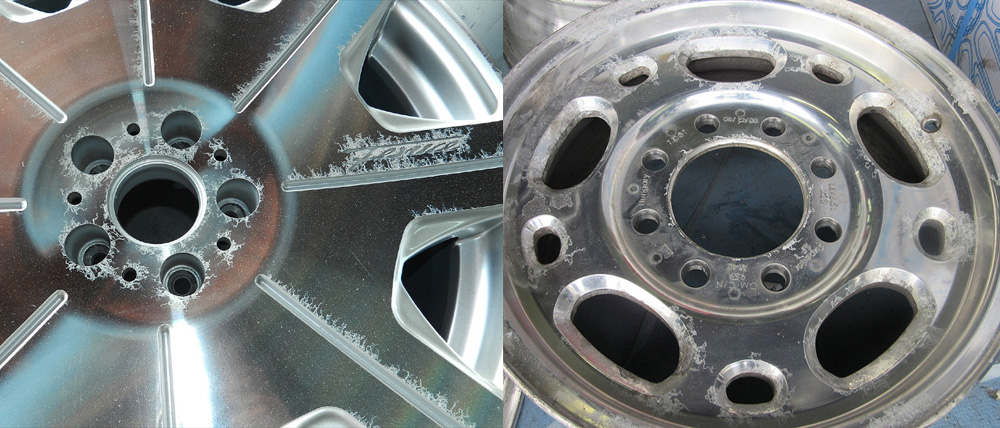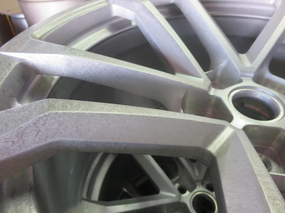 注:)中国製やアメリカ製の鋳造ホイールは新品でもパウダークリアーの高温焼き付けによる「湧き・ブツ」が発生しますのでパウダークリアーは不向きでなその場合低温焼き付けの溶剤クリアーになります。