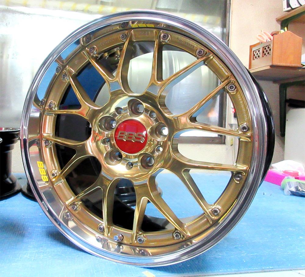 RSワタナベと同じ構造デザインで物議を醸した四半世紀前の最近目にしないある意味レアなBRブラックレーシングのガリ傷リム欠け修理からのGold tasticフルパウダーコートです。